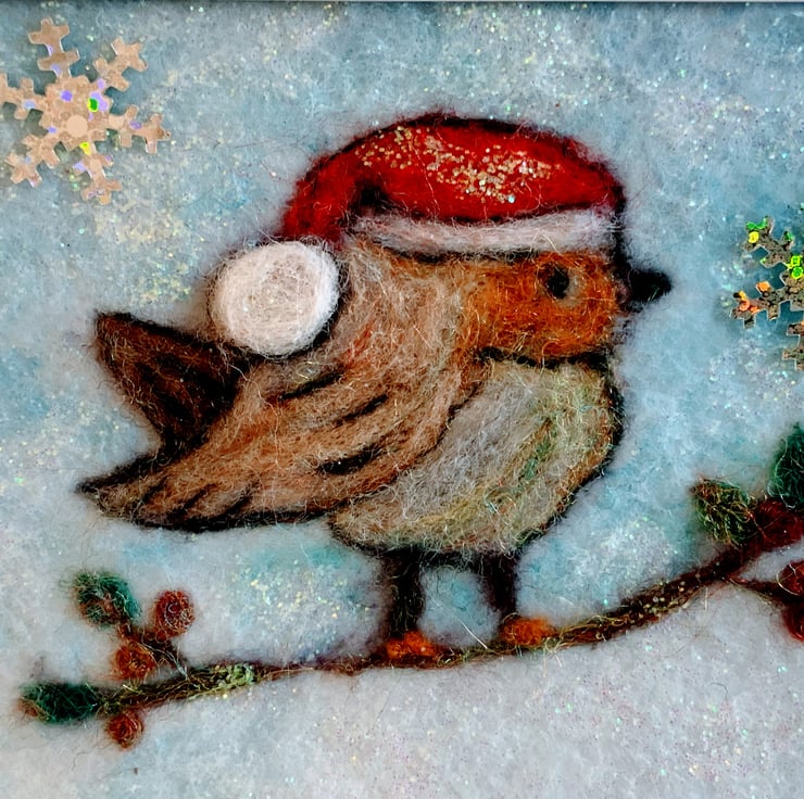 This cute little robin is perched on a branch wearing a santa hat. It is cold and frosty and snowflakes are falling. Made from merino wool within a framed card. Stamped on the back to let you know it is handmade with my signature.