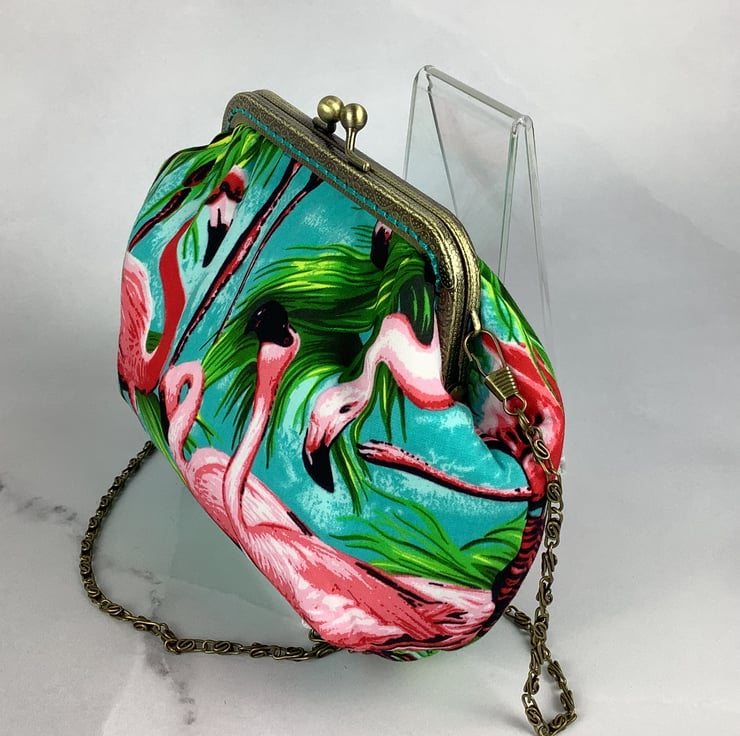 Handmade bag with a kiss clasp frame in a fun tropical cotton fabric.
