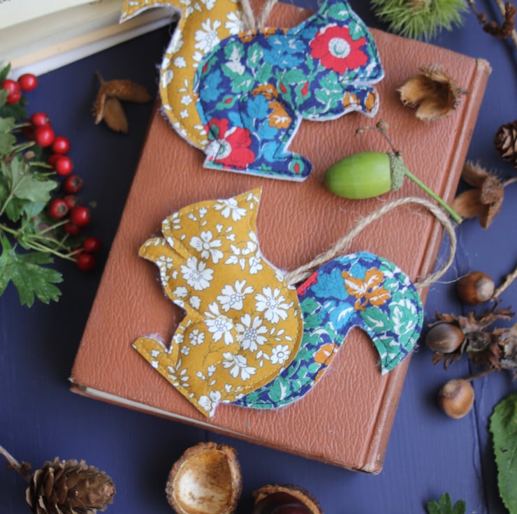 Each squirrel has been created from odds and ends of leftover Tana Lawn Capel (mustard) and Camilla (navy) floral fabrics and measures approximately 10cm from tail to toe. Each one is double sided and made from two different co-ordinating patterns which have been cut out by hand. They contain a layer of polyester wadding to create a padded effect and have a hanging loop made from garden twine.