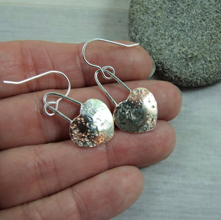 Sterling and Copper Small Rustic Heart Dropper Earrings.