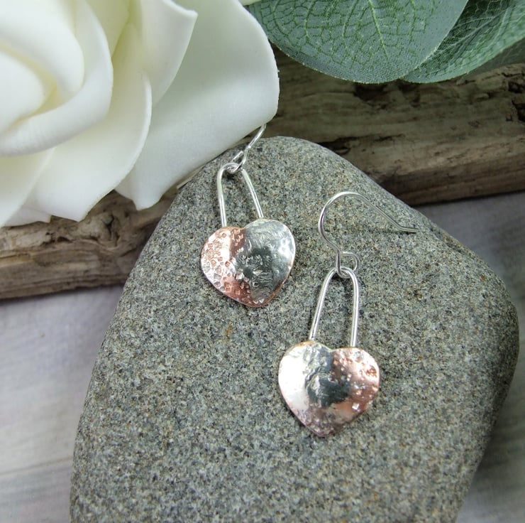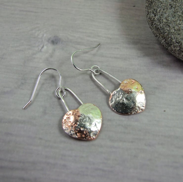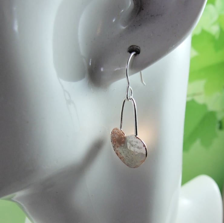I have created the heart shapes from copper sheet, hand cut and half coated in silver then textured with a rustic pattern. I then slightly domed the shapes and then soldered on shaped silver wire and added ear hooks.