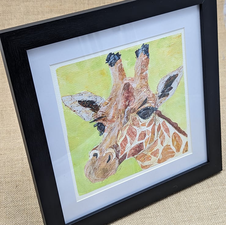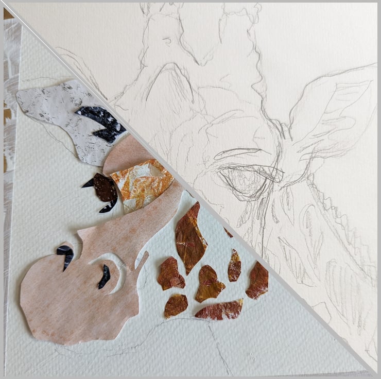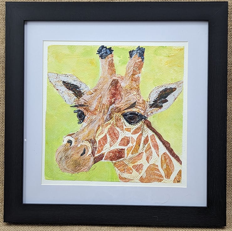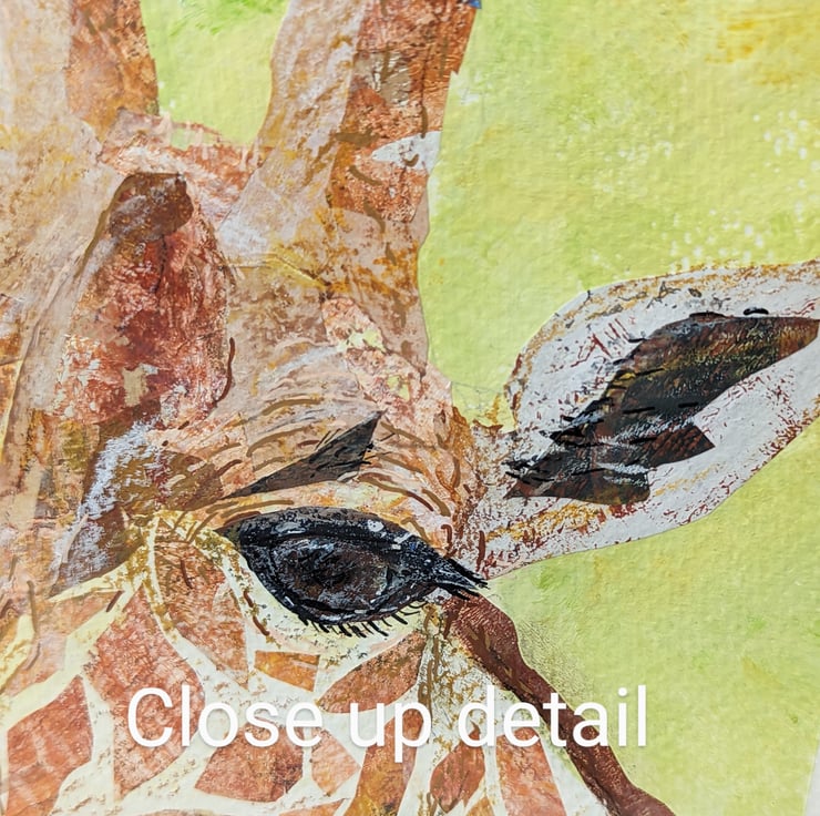 Collage and mixed media artwork of a giraffe. All collage papers are made by me using acrylic paint on a gelli plate. The collage is then hand embellished with neopastels and paint pens. I sketched the giraffe freehand and use that to create the collage. And as can be seen from my process photo I can change my mind about the colour! Background is painted with acrylic paint.