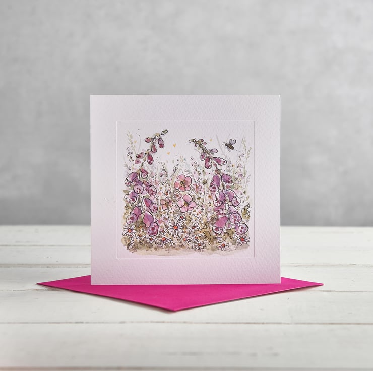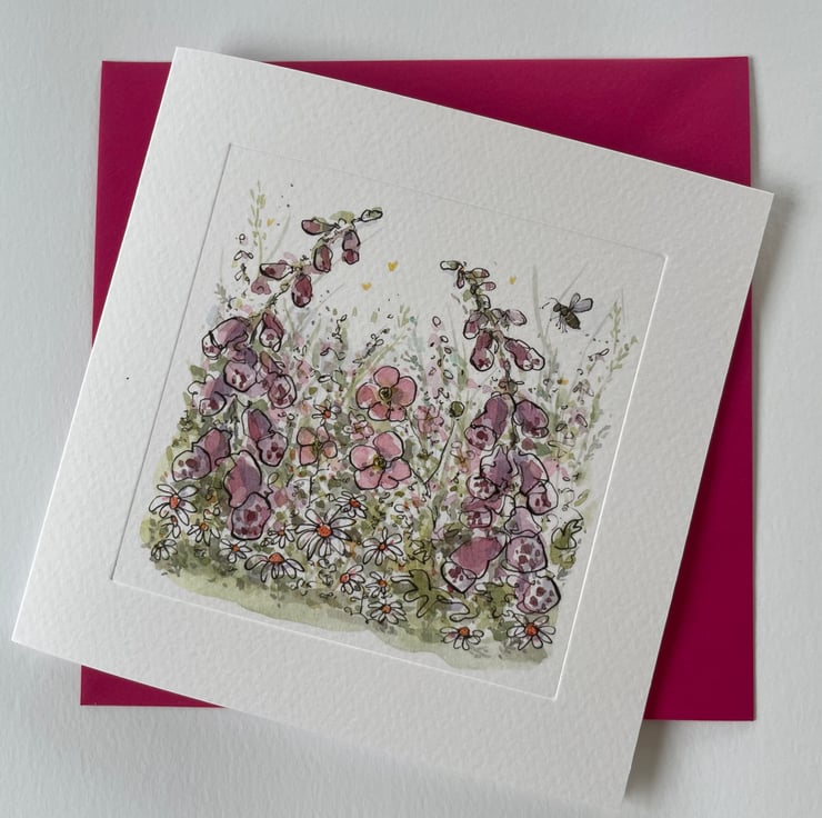 A pretty everyday flower card full of foxgloves, daisies and Japanese Anemones. Perfect to keep in touch with friends or send to someone special for a birthday or a wedding. Hand painted with watercolour and ink by me, printed in the UK. This card is also de embossed to give it more impact. 15 x 15cm card with envelope. The card is blank inside for your own message
