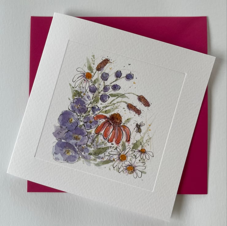 A pack of flower cards -5 cards in total. Great as a gift and Perfect to keep in touch with friends or send to someone special for a birthday or a wedding. Cards have a recycled bellyband wrapped around them to keep secure. Hand painted with watercolour and ink by me, printed in the UK. This card is also de embossed to give it more impact. 15 x 15cm card with envelope. The card is blank inside for your own message