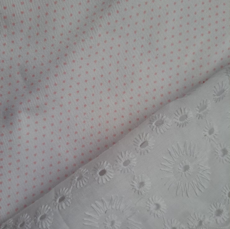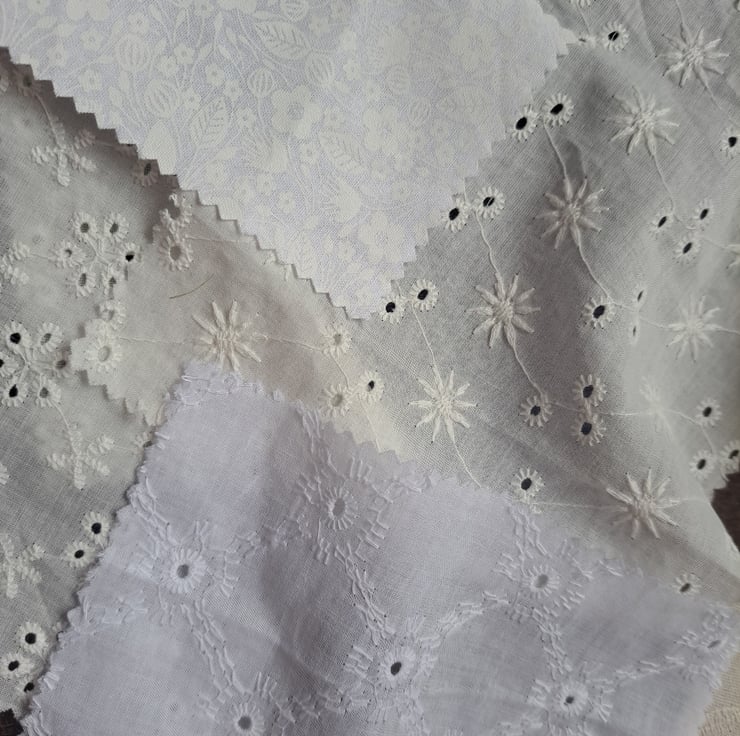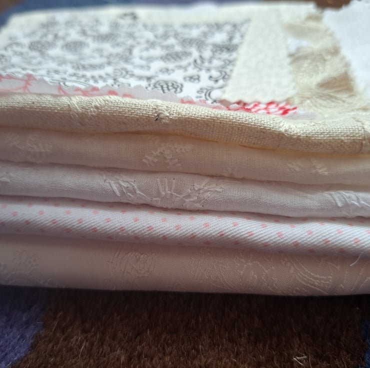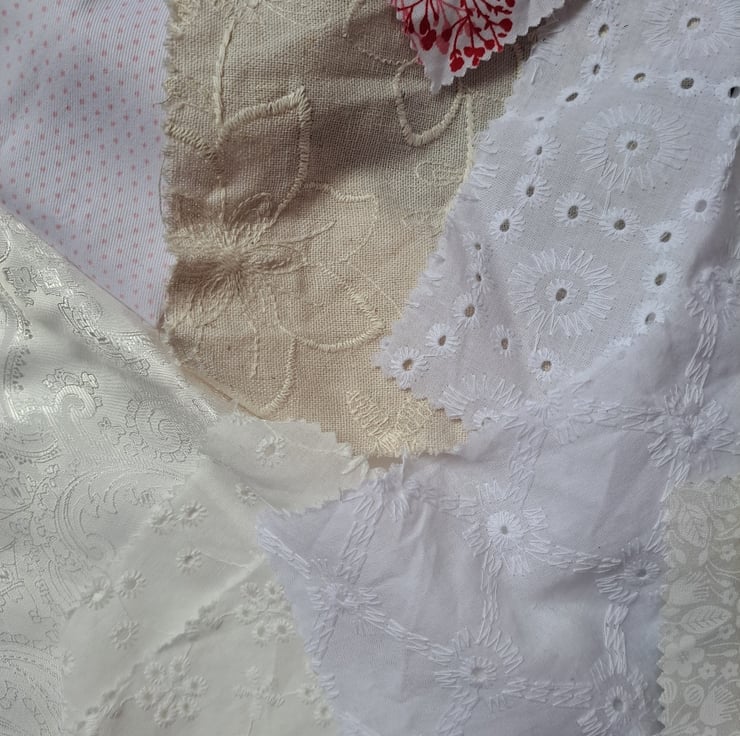 Everyone needs white and cream fabric in their stash. This collection of 14 assorted pieces has some really lovely additions, including a large piece (133cm by 59cm) or white paisley brocade, white quilting cotton with pink polka dots and sample sweet squares of Broderie Anglaise. Doll's dresses? Embellishments? Brooches and hair scrunches? Endless uses.