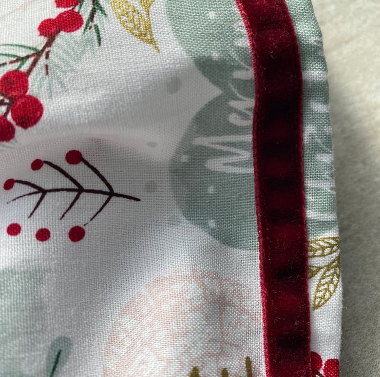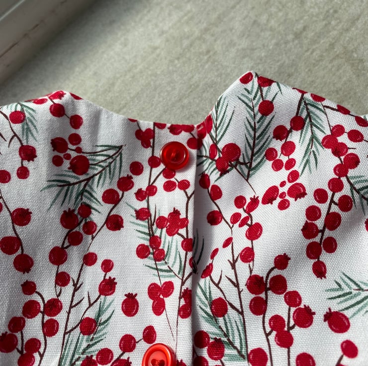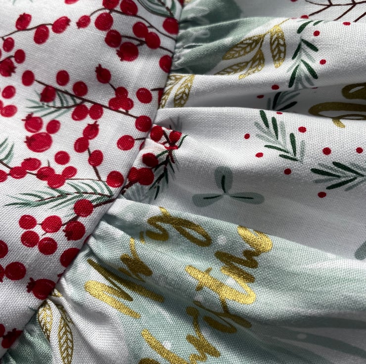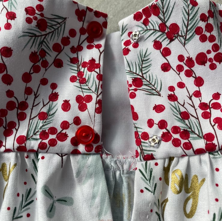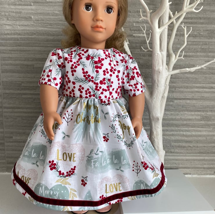 Dolls Christmas dress, compiling two prints Christmas wording with a hint of metallic gold with a berry print bodice. The dress is trimmed with red velvet ribbon.