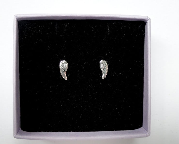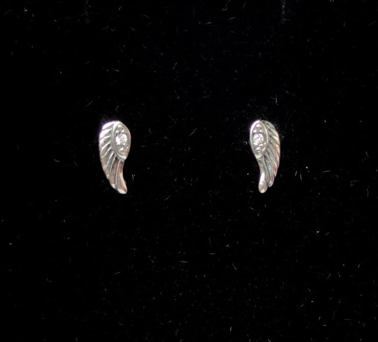This listing is for a pair of adorable sterling silver angel wing stud earrings. The angel wing studs have tiny cubic zirconias and measure 8mm. Also include sterling silver scroll backs.