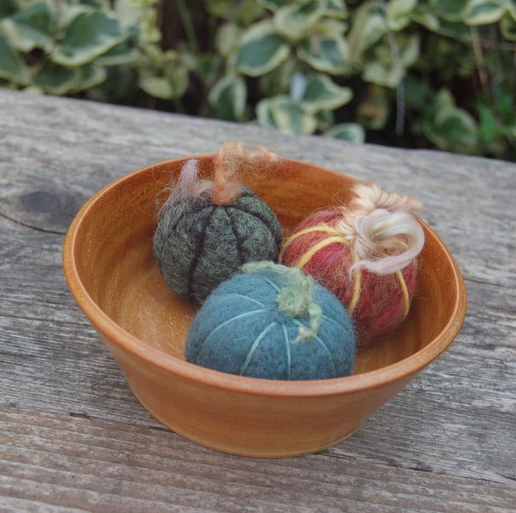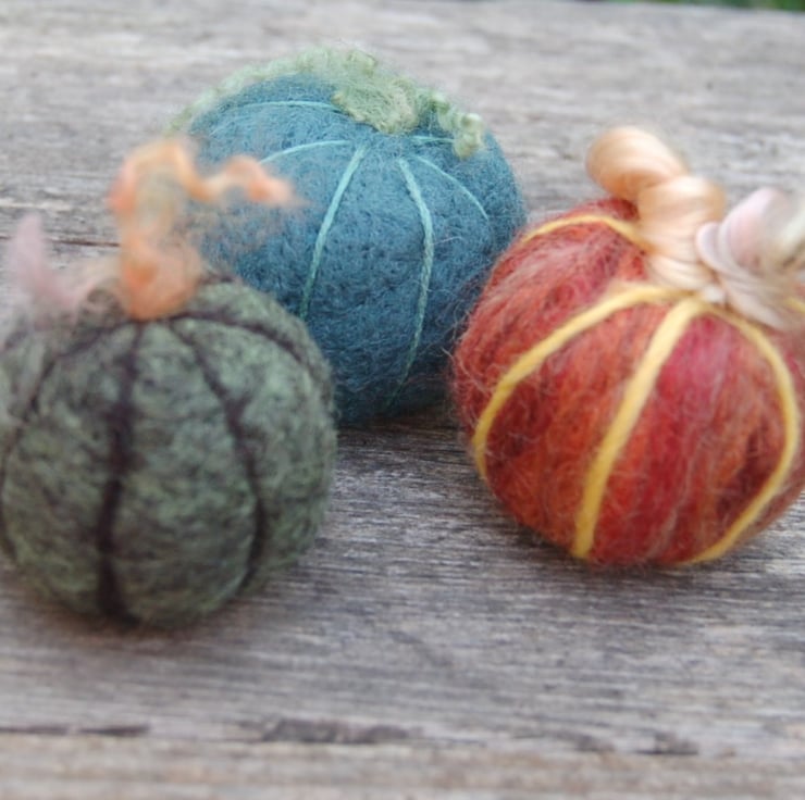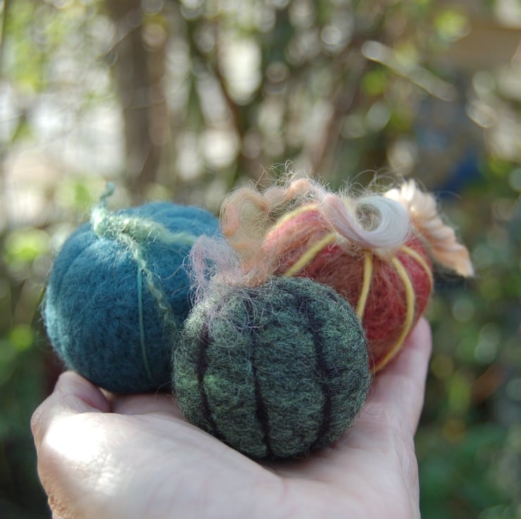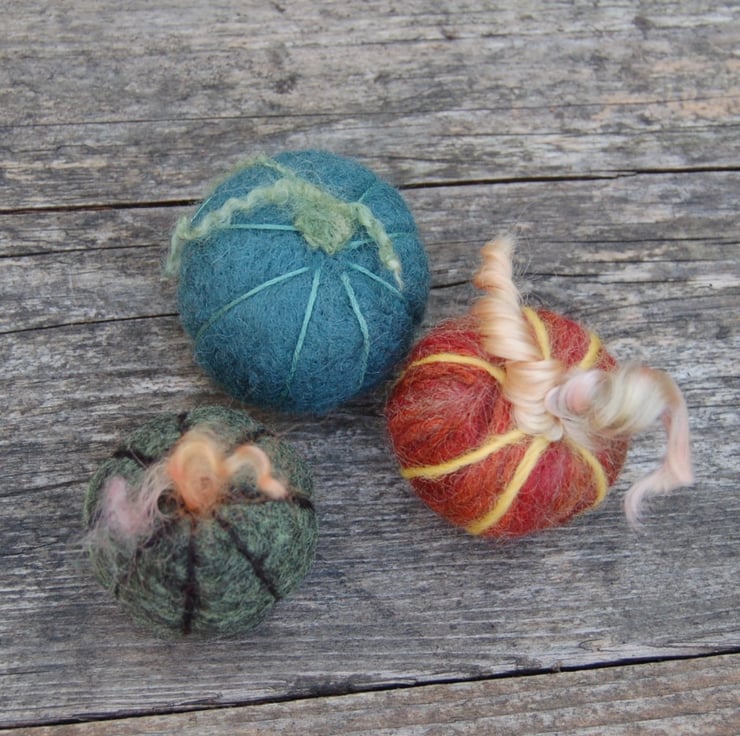 A set of three pumpkins made from wool by needle felting dyed fibres into shape and adding wool curls for stems.