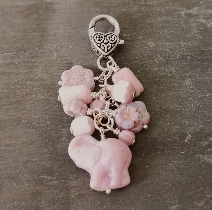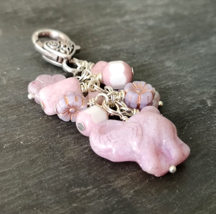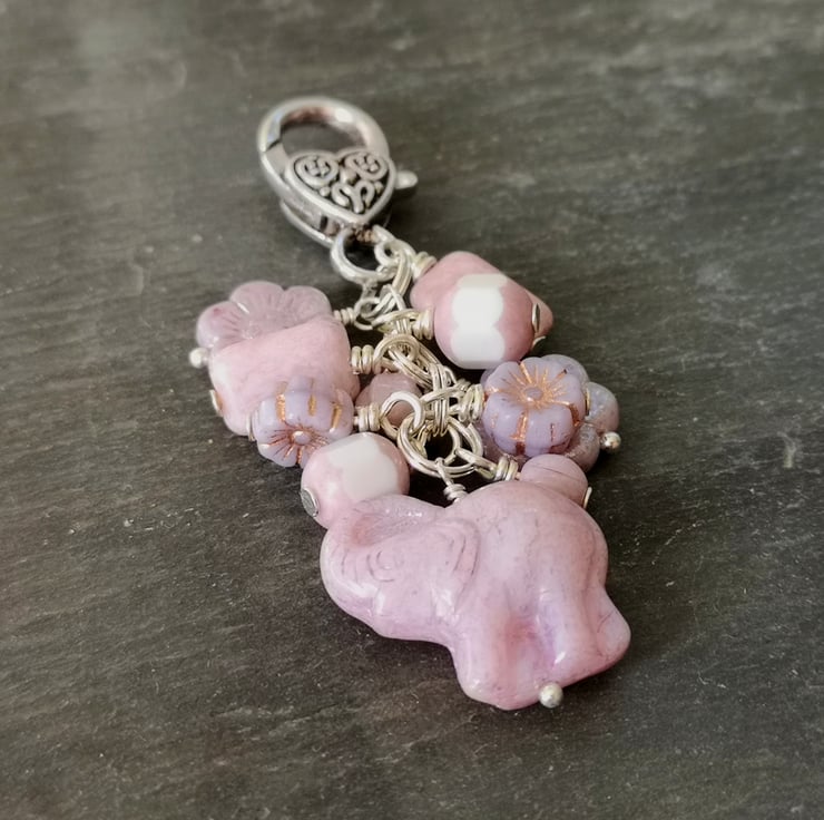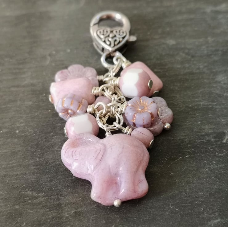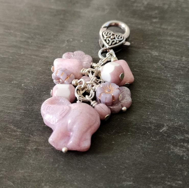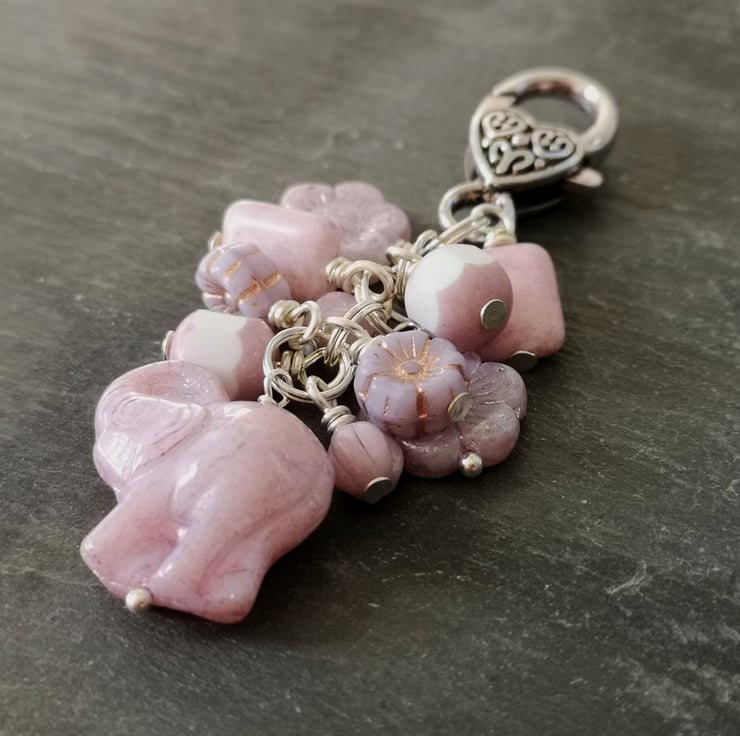 This silver plated bag charm has been decorated with lilac Czech glass beads in different shapes and sizes. They include a few dainty flowers with metallic detailing, with a larger elephant shaped bead as the focal point.