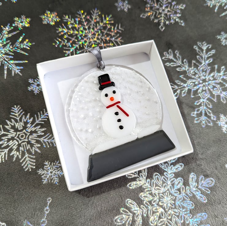 Hand crafted Fused Glass Snowman Snow Globe Style Hanging Decoration.