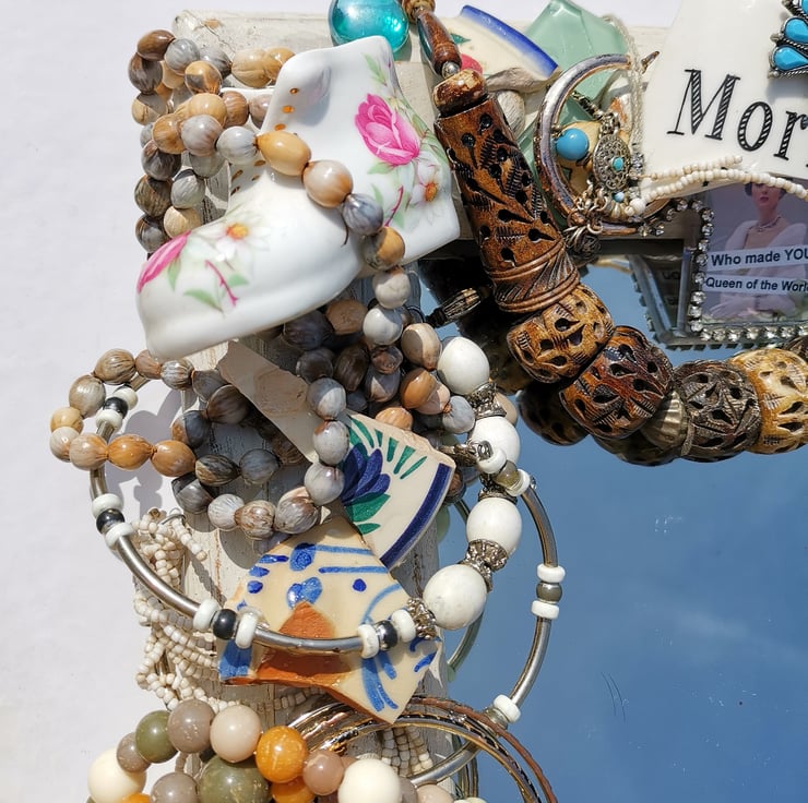 Made from rescued, recycled, reclaimed and collected objects, this piece, like all of my works, is a complete one-off and captures quirkiness at its best! Every object is individually chosen and attached making this mirror an absolute original. it's 30x40x10 cm.