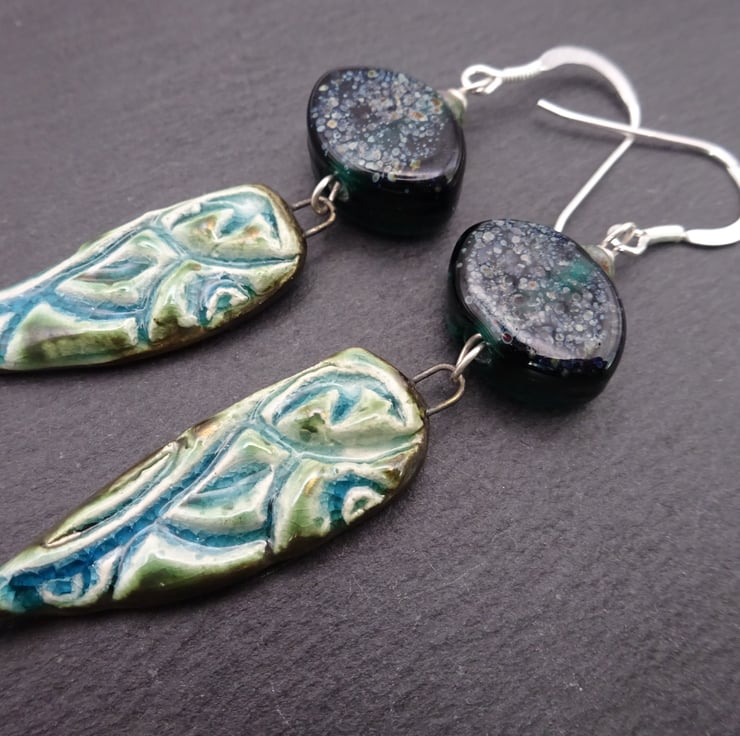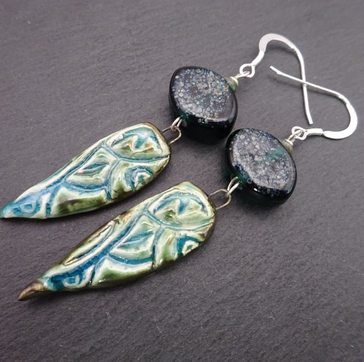 A pair of earrings made with sterling silver ear wires, handmade lampwork glass beads and handmade ceramic drops.