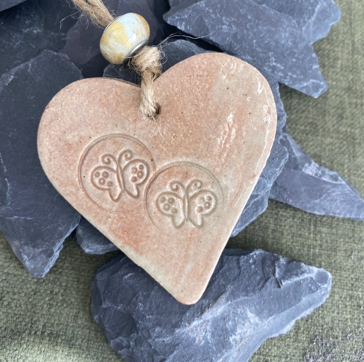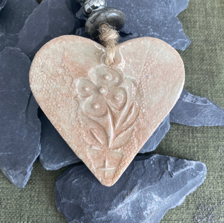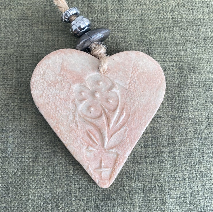 Each heart is hand made from hand pressed earthenware clay. Stamps have been pressed into the clay.