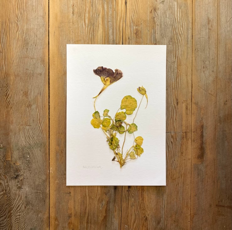 The nasturtium is symbolic of courage, postivity and strength. I grew these to add colour and flavour to salads, but then looking at their tangly roots and the varied colour of the leaves, decided a few needed pressing.