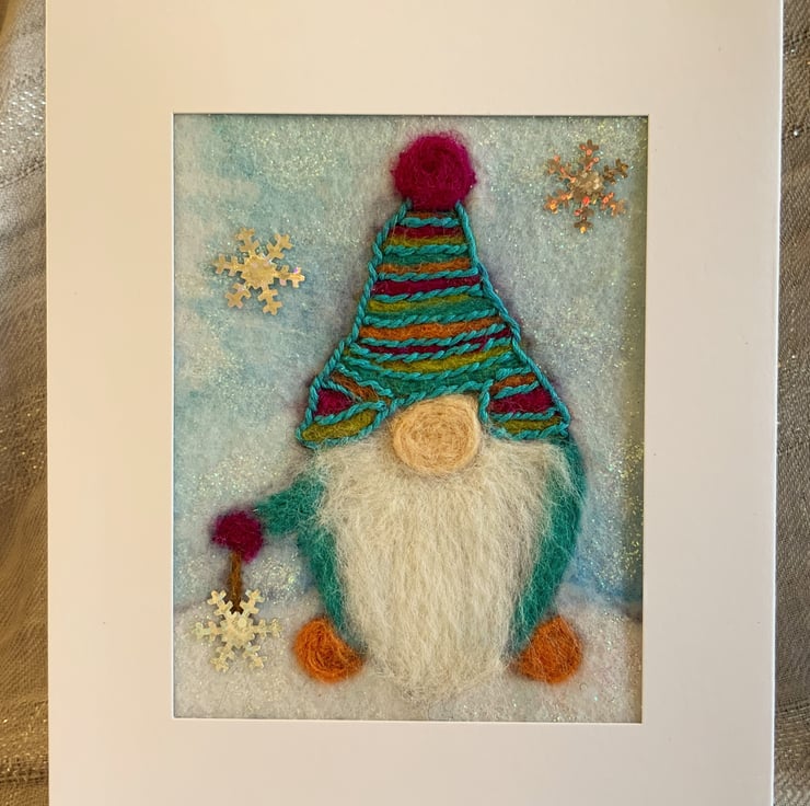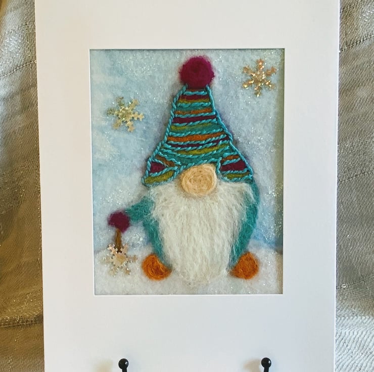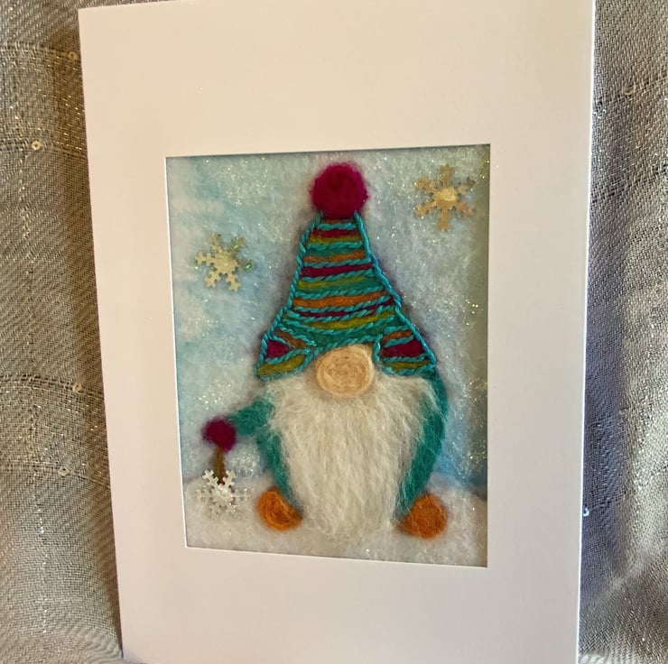 The festive Gnome has a lovely fluffy wooly texture and the background is full of sparkle.
