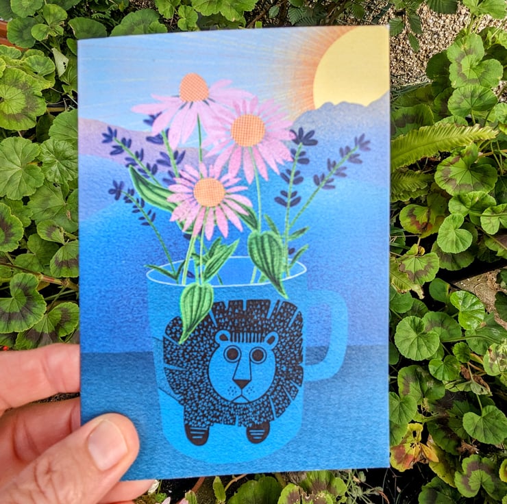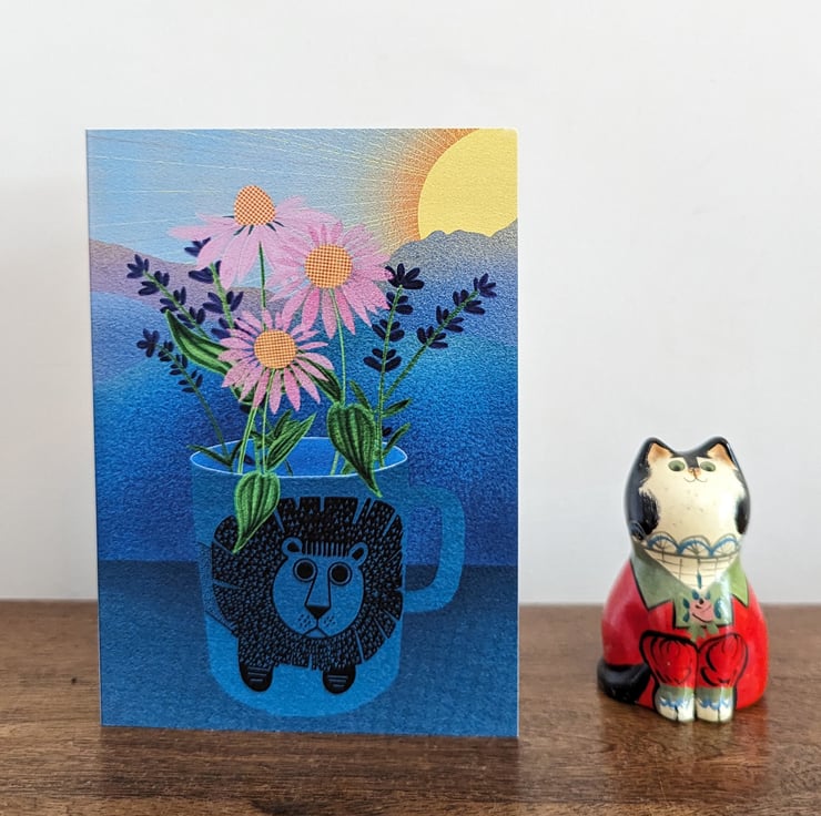 My digital painting of summer flowers (lavender and echinacea) in a retro lion mug has been professionally printed onto 350gsm recycled card.