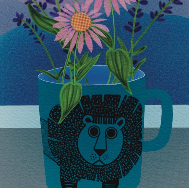 I created a series of four paintings based on the work of John Clappison who designed for Hornsea Pottery back in the 1970s. The mug in this print is my version of his brilliant Newsprint Lion. The flowers are lavender and echinacea.