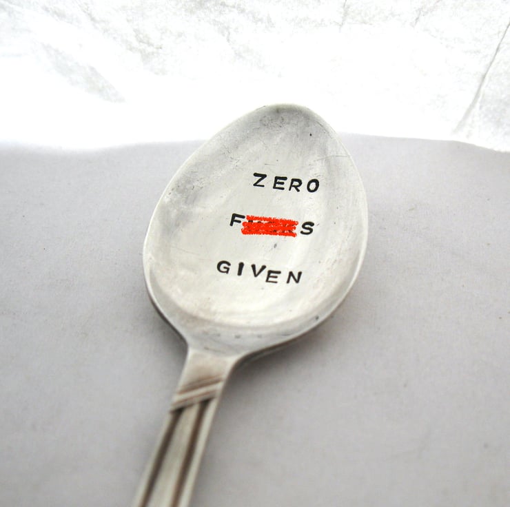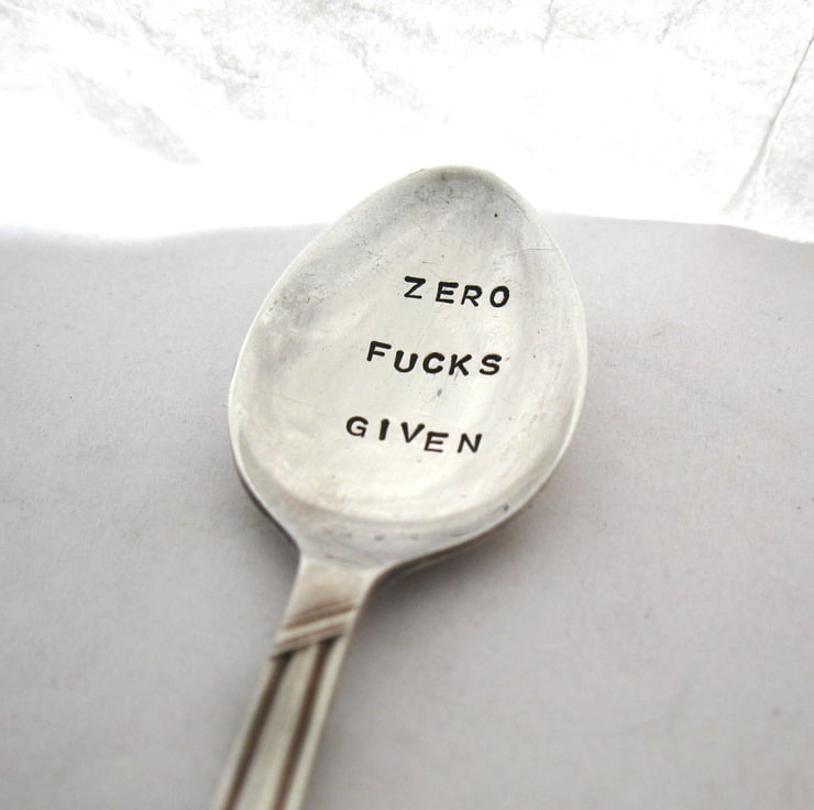 A rude coffee spoon with the handstamped wording ZERO F---S GIVEN. Because sometimes that's what you have to do to get through the day. It's a vintage floral silver-plated (EPNS) coffeespoon approx. 12cm long and the lettering is coloured with a non-toxic, water-based acrylic ink.