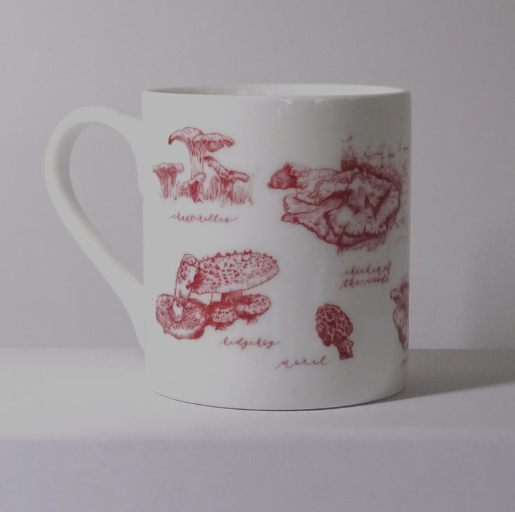 Delicate bone china mug printed in the UK with detailed pen illustrations of nine varieties of edible mushroom found in the British Isles, including: Chanterelles, Chicken of the Woods, Hedgehogs, Morels, Oysters, Saffron Milkcaps, and Shaggy Inkcaps in a vintage-style colour palette. Each mushroom has a hand-written name label.