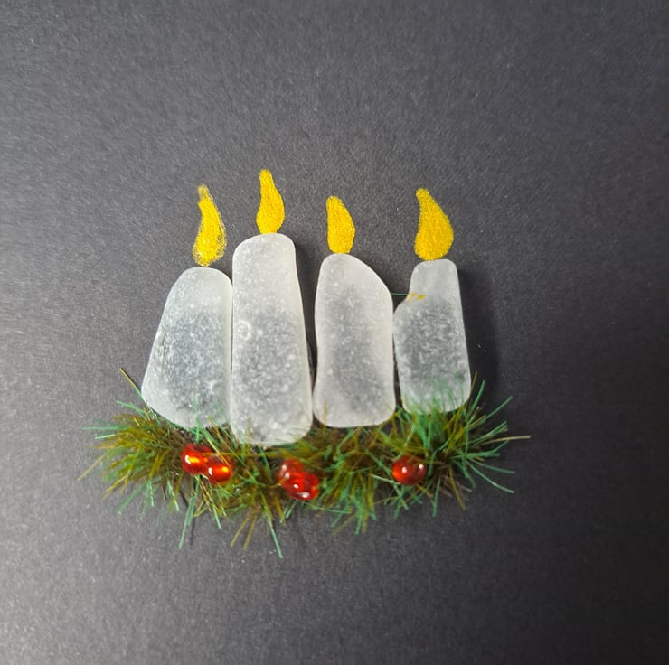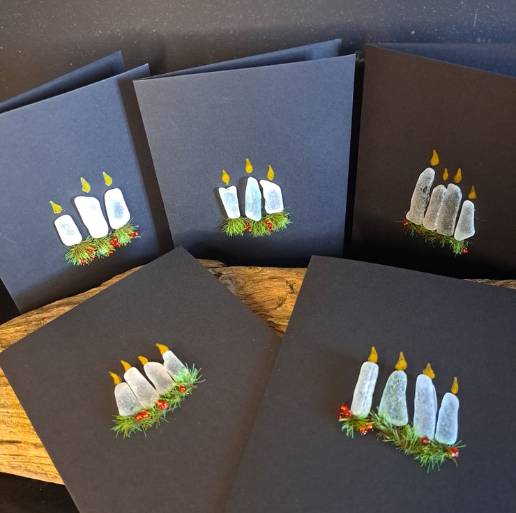 Sea glass that has been lovingly sourced from the Kent coast has been used to make these cute Christmas candle cards on contemporary black card. There are five in the set. A white insert has been provided to write your festive message on. The price is for the set of five. Included is a self coloured envelope.