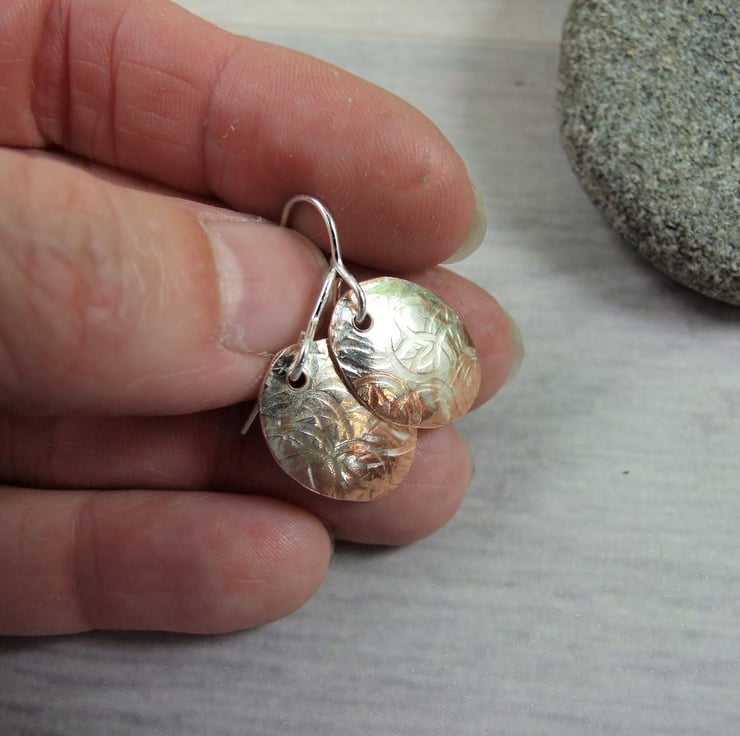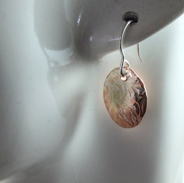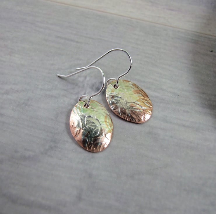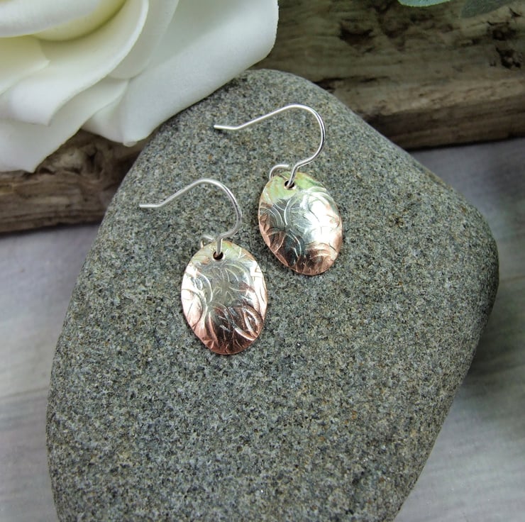 I have created the oval shapes from copper sheet, hand cut and half coated in silver then textured with a rustic circles pattern. I then slightly domed the shapes then added ear hooks.
