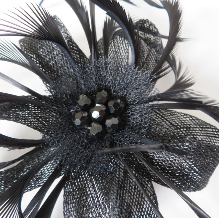 Complemented with black curled biot feathers and finished with a black tulle ruffle, and a cluster of black glass crystals.