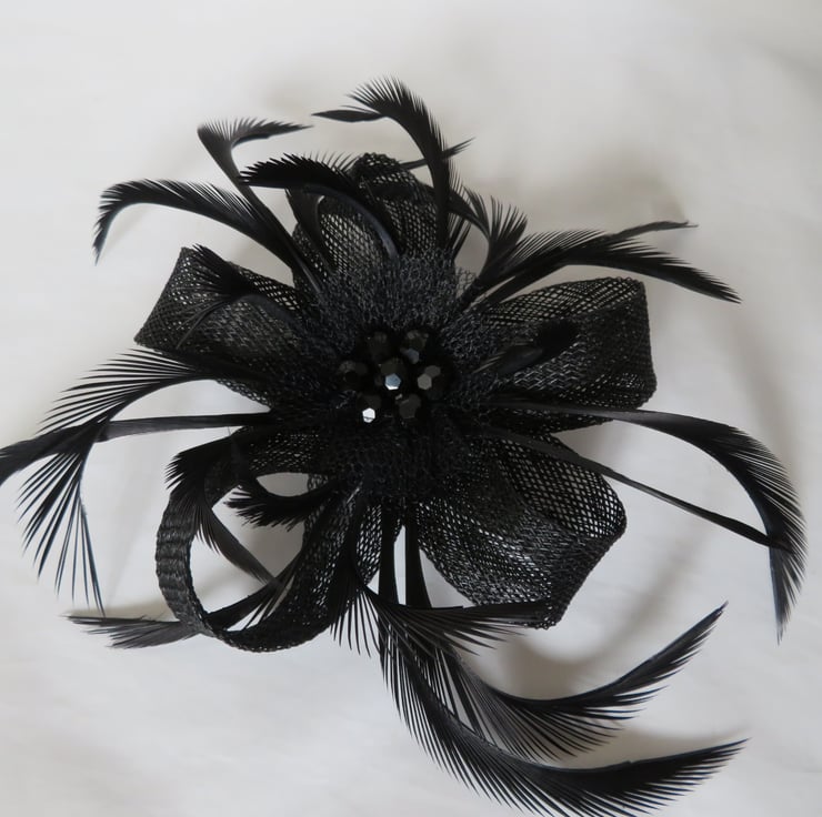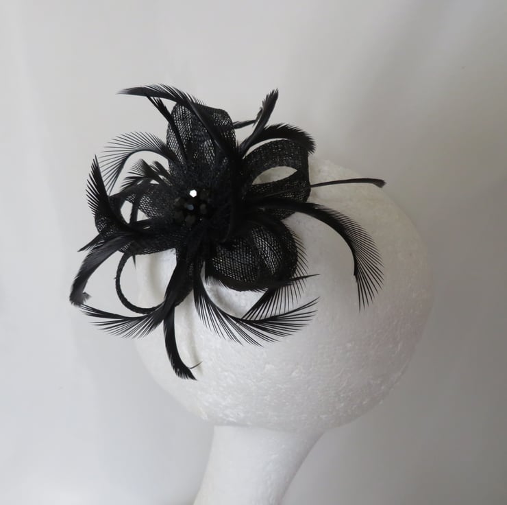 Black Feather & Crystal Small Sinamay Loop Clip In Fascinator