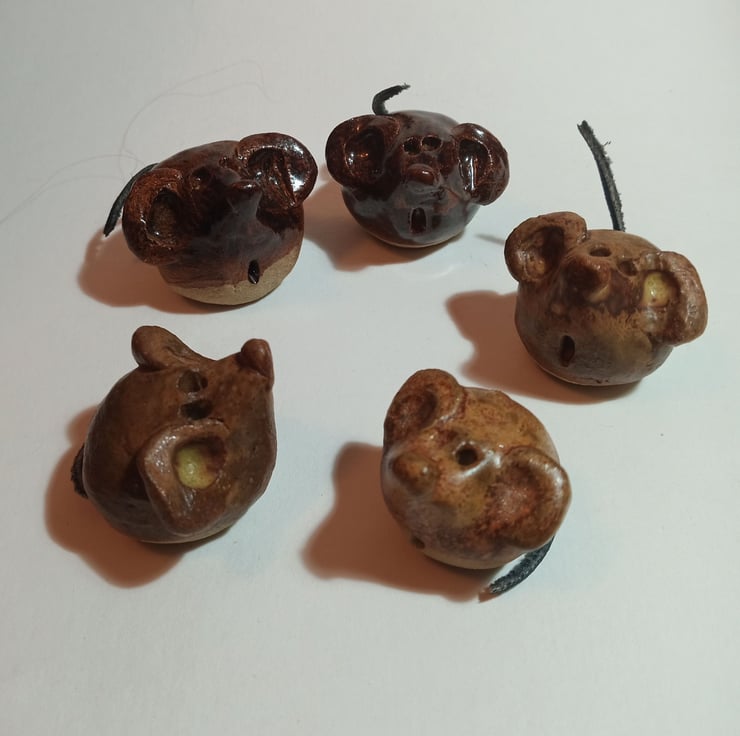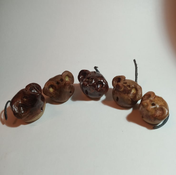 A set of five lovely little ceramic mice. Handmade in stoneware clay and glazed in various shades of brown.