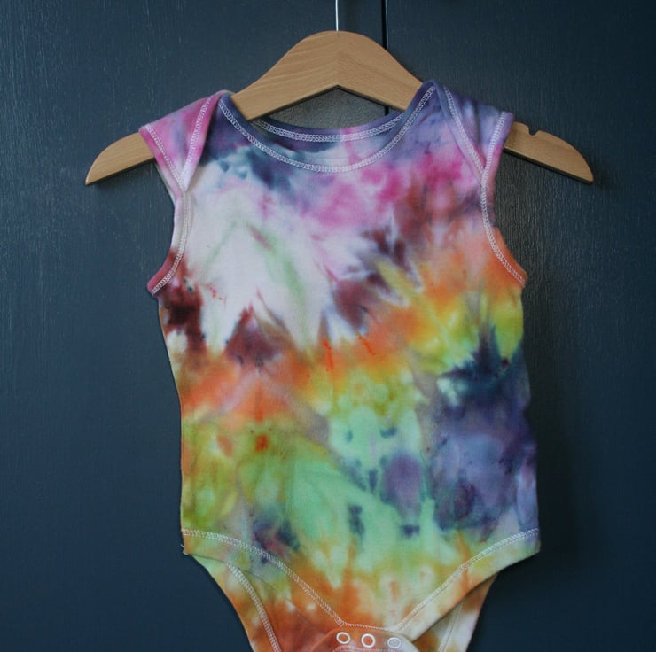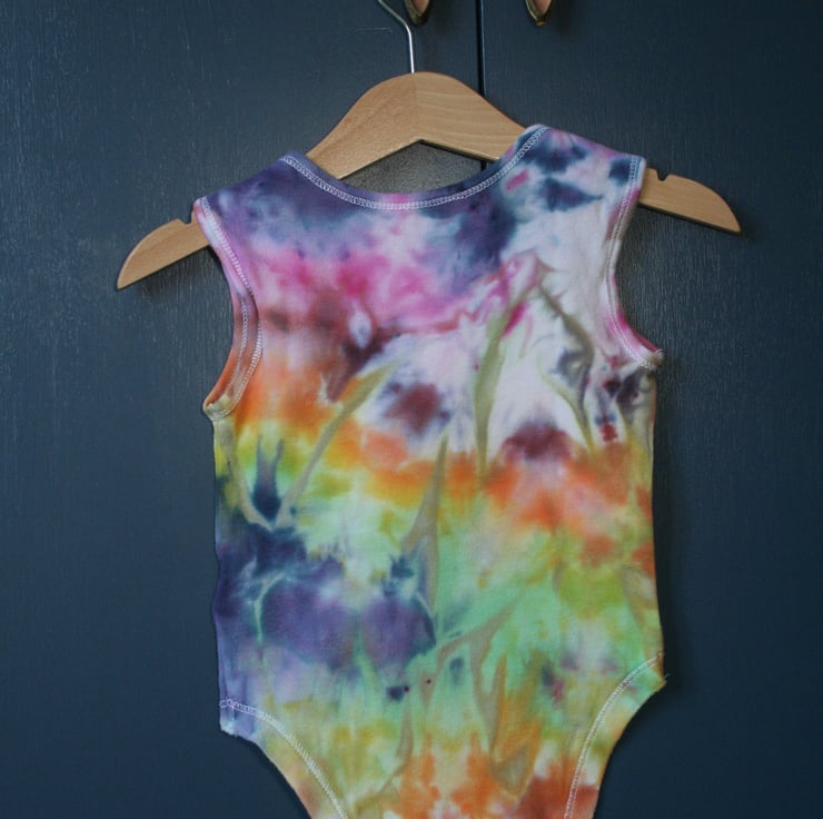 Beautiful rainbow colours and patterns created in this hand ice-dyed vest. Size 12-18 months, unisex. This is a second chance item.