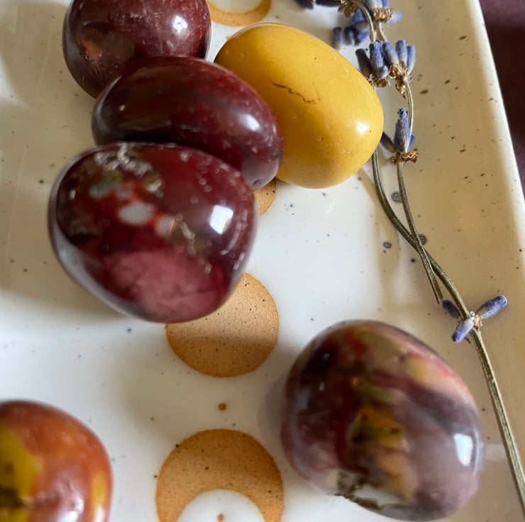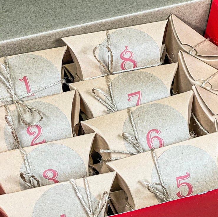 24 Day Advent calendar with a selection of tumbled and raw crystals .