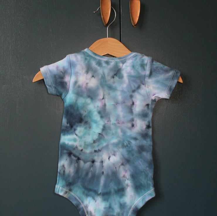 A really beautiful swirl created in a range of Blues on a 6-9 month, short sleeved vest. Lovely colour splits and patterns. This is a second chance item.