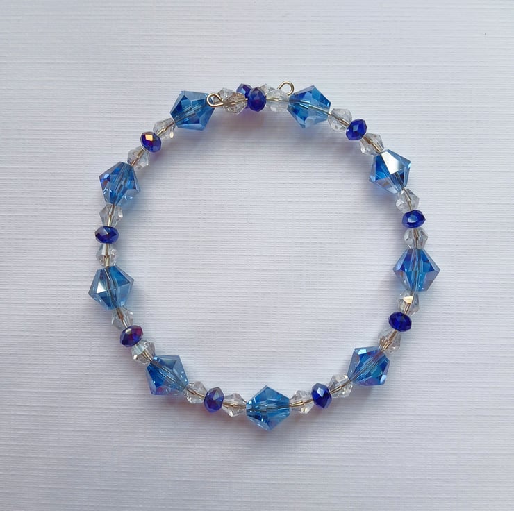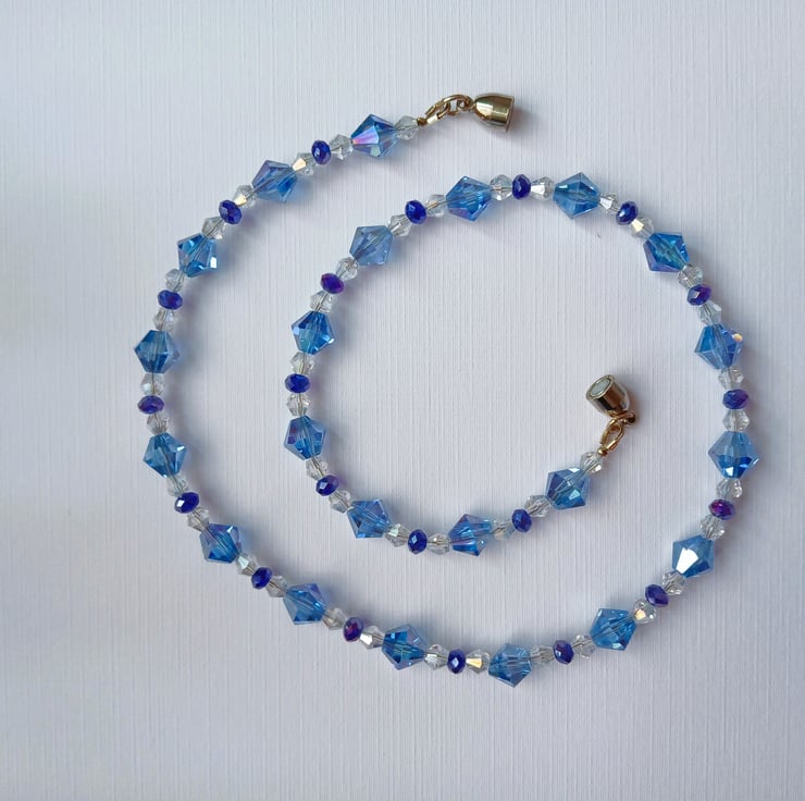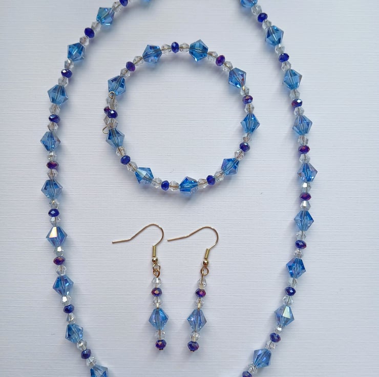 Set of three items comprising necklace, bangle and drop earrings in lilac, purple and clear crystal. The necklace measures 45cm from one end of its magnetic clasp to the other. The bangle is made from memory wire and measures approximately 6.5cm in diameter. It clings to the wrist with no need for additional fastenings and is very easy to slip on and off, while remaining securely in place during normal wear. The earrings are just under 3cm from the bottom of the fish hook. Please note the findings on these pieces are not sterling silver.