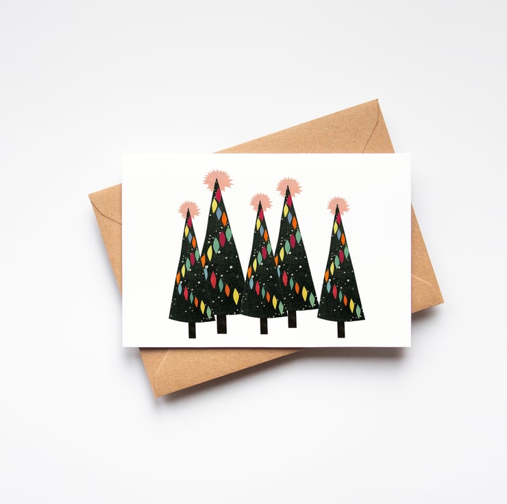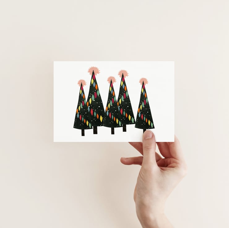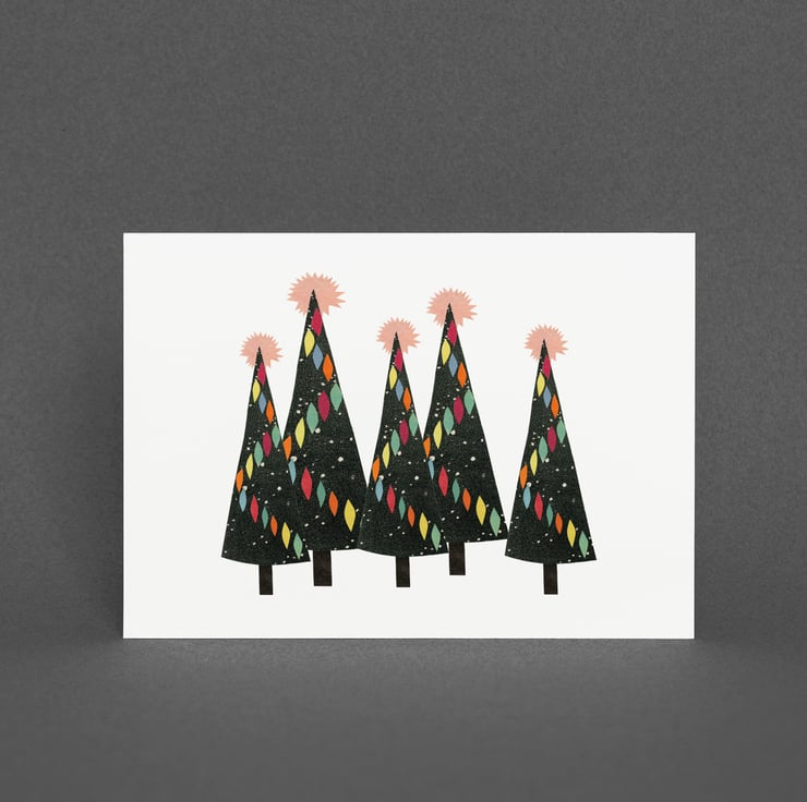 A mid century style Christmas tree card featuring a forest of fir trees decorated for the big day.