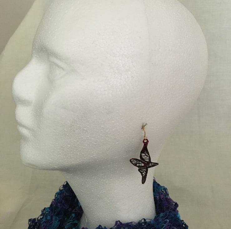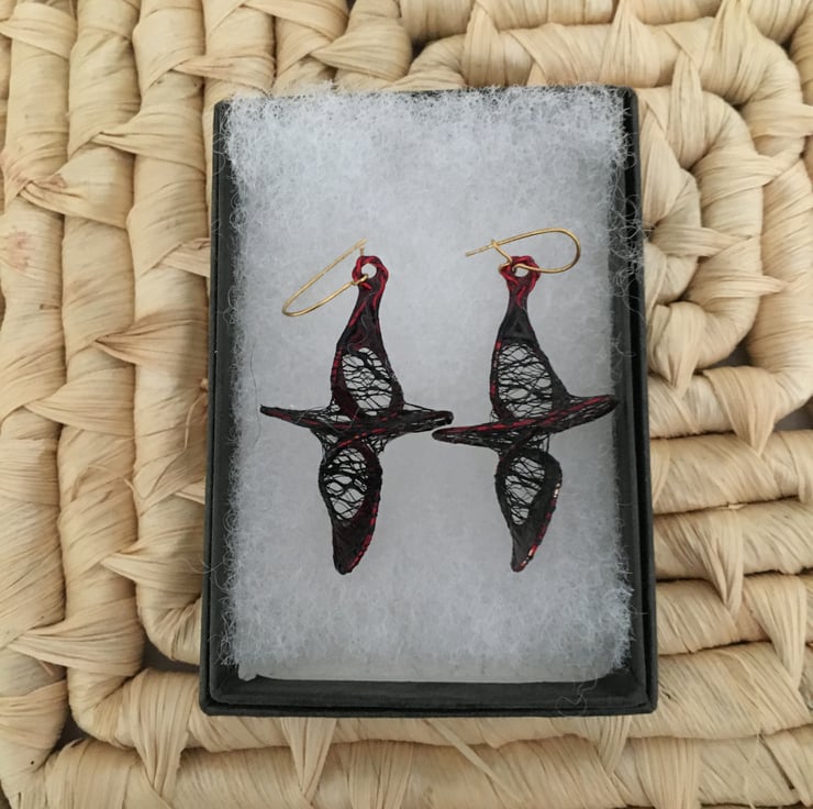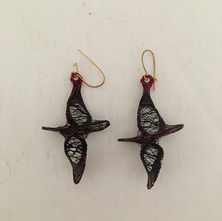 These are made by forming a wire frame adding twists and turns to create the desired outline of the earrings. This is then coated with the lacquer resin to colour the frame, the resin is then stranded around the frame to produce the net effect with more resin introduced to cover some of the open areas between the strands.