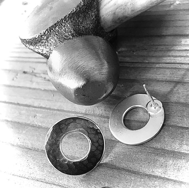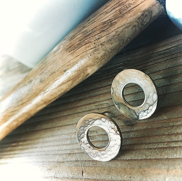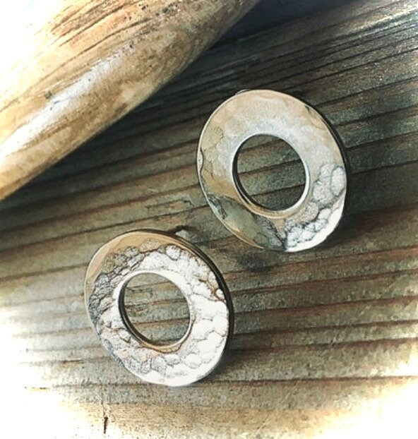These sterling silver hammered washer hoops are so popular. They are each individually made so totally unique. The hammered effect is polished and sparkles when catches the light. They are approximately 15mm in diameter. The earring backs are sterling silver and sit comfortably and securely making these favourites with AliCat customers.