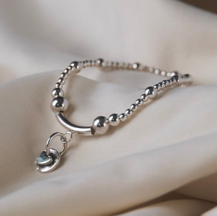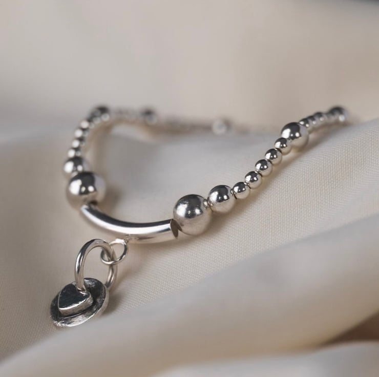 Each solid silver bead is threaded by hand individually to high quality jewellers elastic. This one carries a handcrafted silver AliCat artisan heart charm set on a sterling silver tube bead. This one of a kind meaningful piece looks great when worn separately or when stacked with other AliCat storytelling silver stacking bracelets that can be personalised.