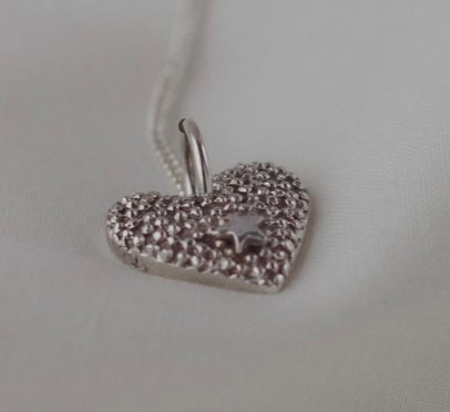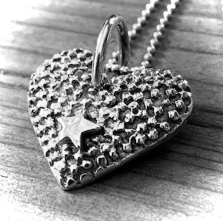 This is an individually handcrafted heart from solid recycled sterling silver. Within this textured silver heart sits a small shiny star that can signify meaning. This is a unique pendant that hangs beautifully on a sterling silver sparkly cut 18 ball chain. the chain is included with this piece.