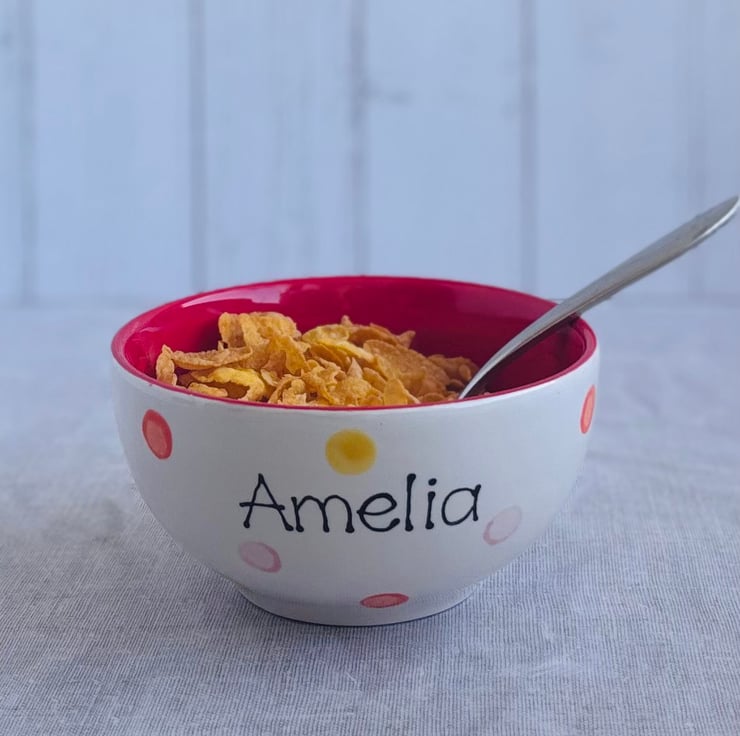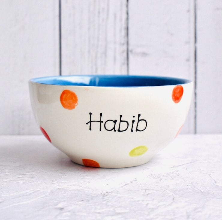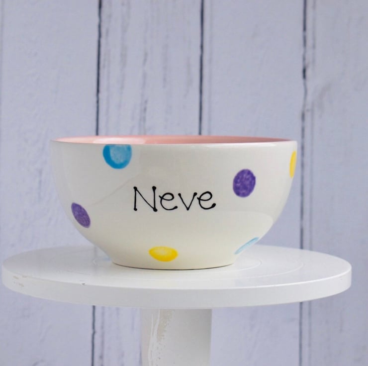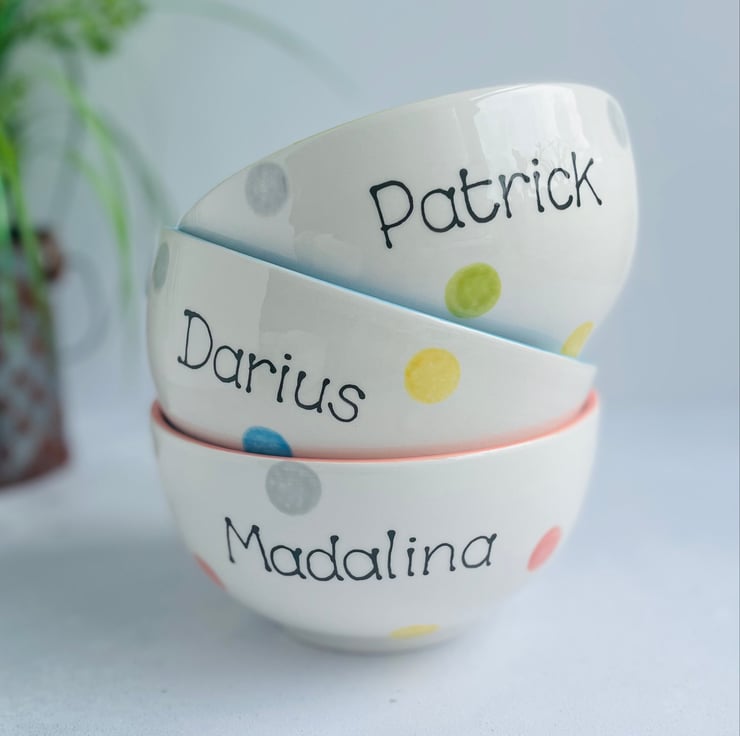 Please specify name of your choice and up to 3 colours of dots when you order. See colour tile in photos for available colours.