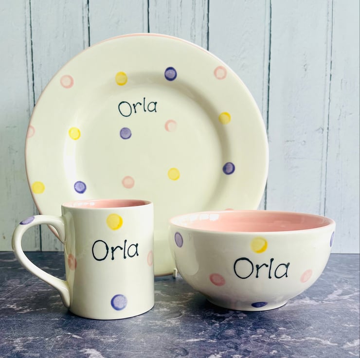 Please specify name of your choice and up to 3 colours of dots when you order. See colour tile for available colours.
