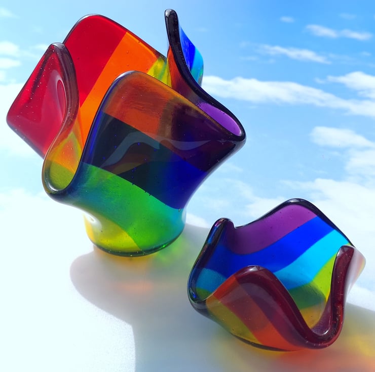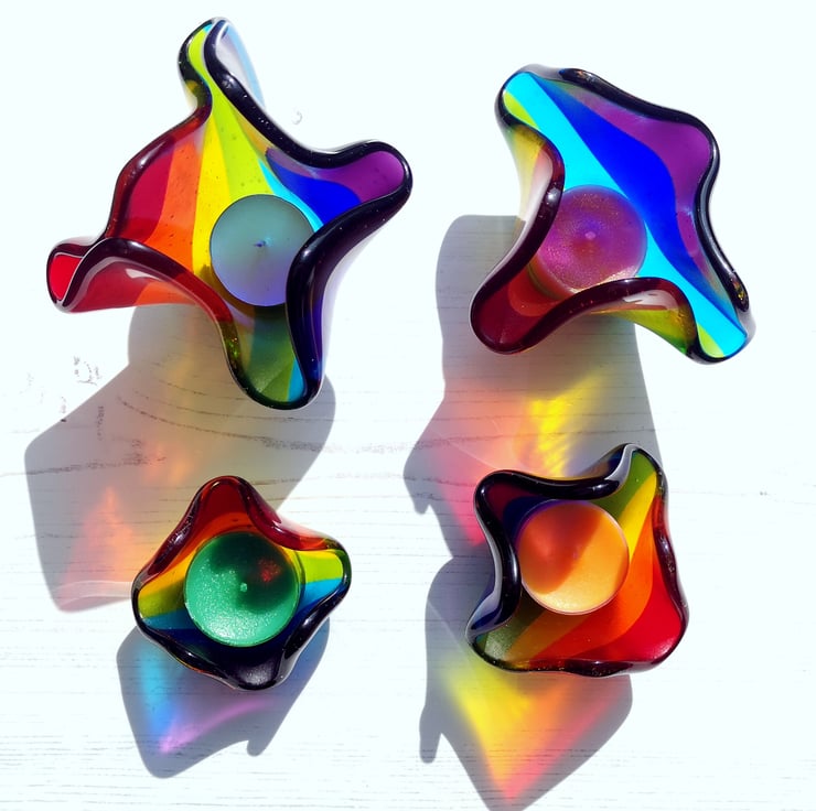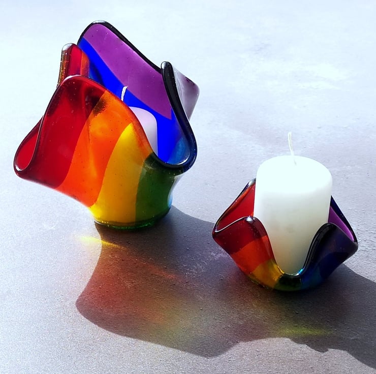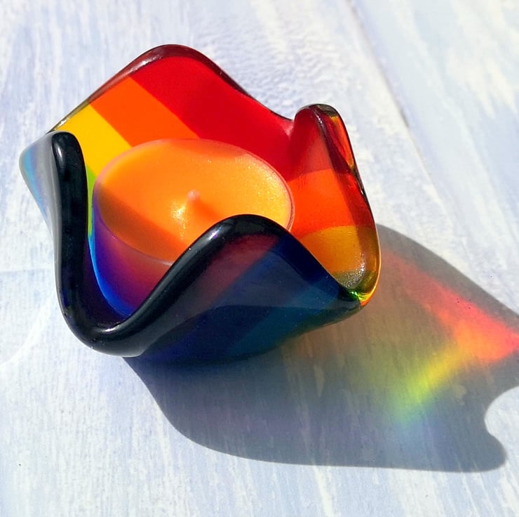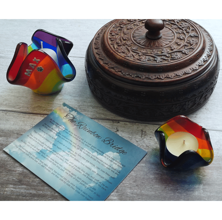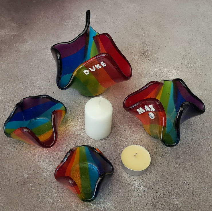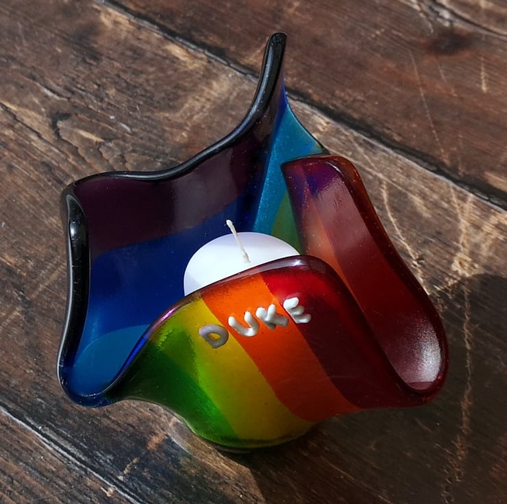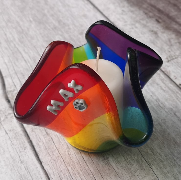 A Rainbow Tealight Candle Holder. Handmade from glass that has been fused in a kiln, using only fully tested & compatible best quality art glass. Can be ordered as a plain candle holder in 4 different sizes. The 2 larger sizes can be personalised with a 3D name, or a 3D name & paw print . The 3D pieces are made from powered glass that are fused together into their solid glass shape in the kiln.