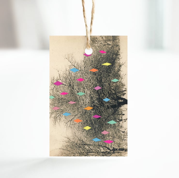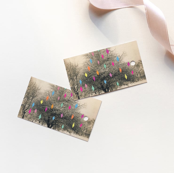A wonderful set of 12 Christmas gift hang tags with string. A vintage winter snow scene with a modern twist. Each tag is made by hand!