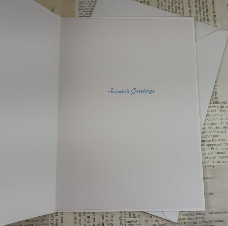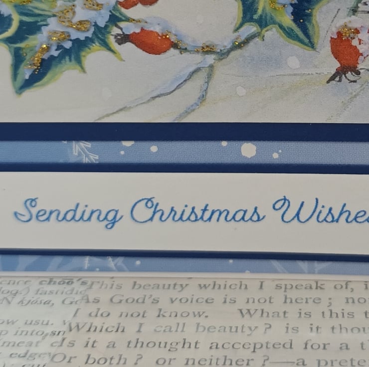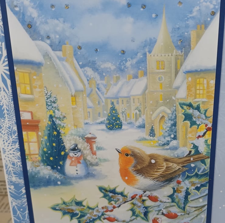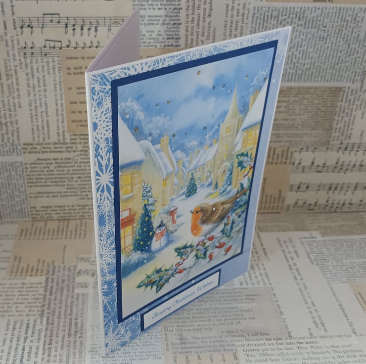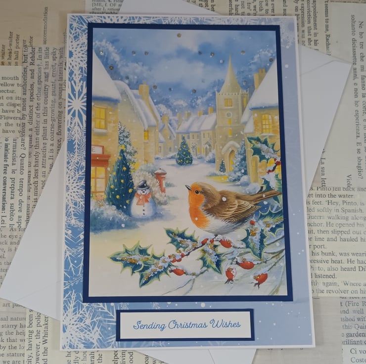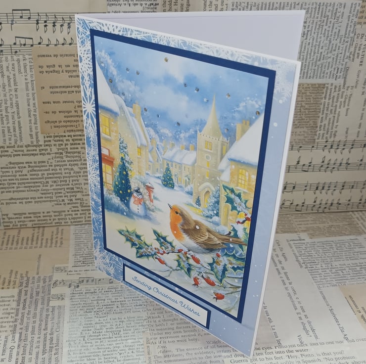Handmade Christmas card featuring a robin sitting on a holly branch, with a snowy village scene in the background. The image has been mounted onto dark blue card over a blue and white snowflake patterned background. The sentiment reads: 'Sending Christmas Wishes'. The snow on the holly and the falling snow have been glittered for an extra bit of Christmassy sparkle.