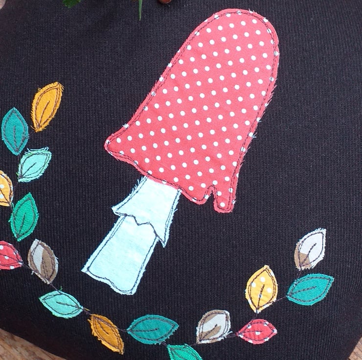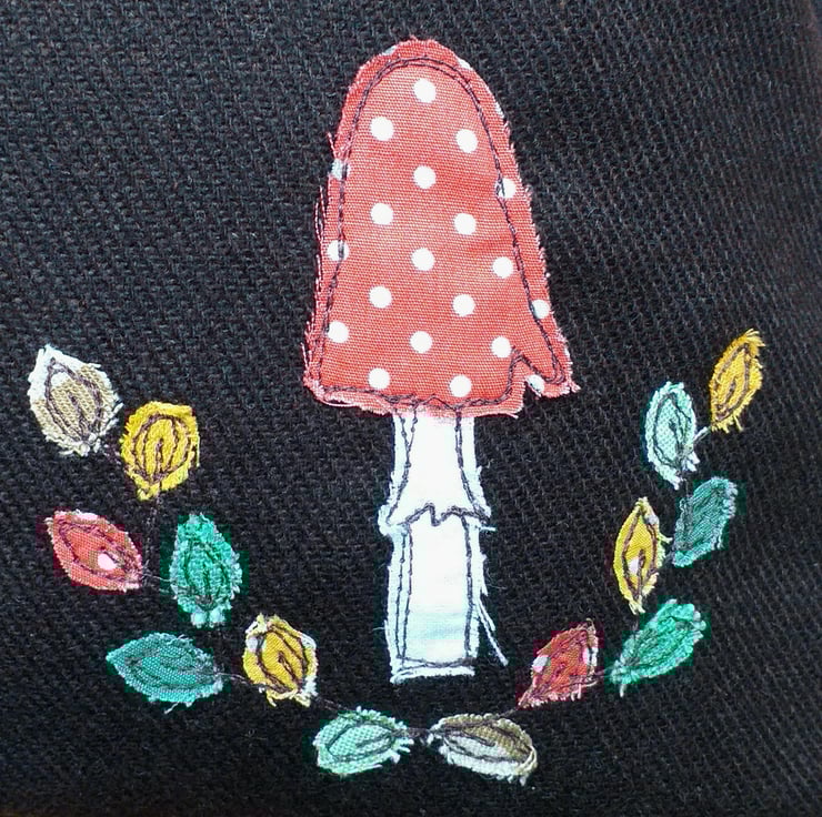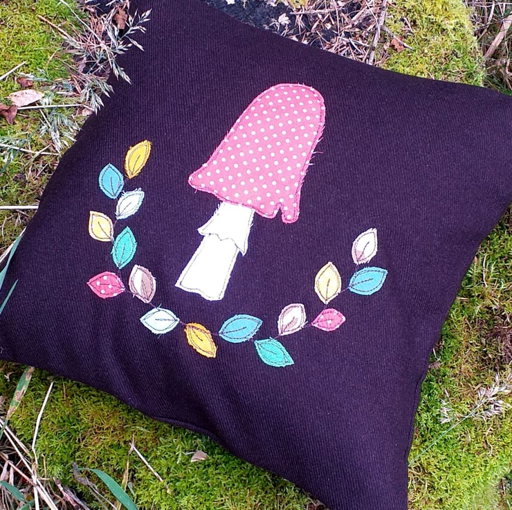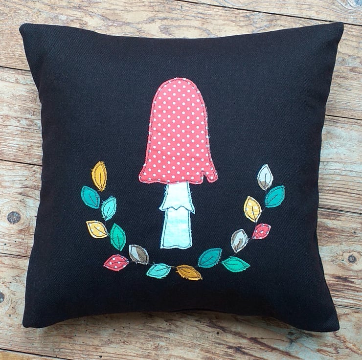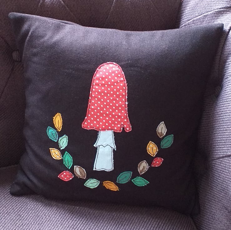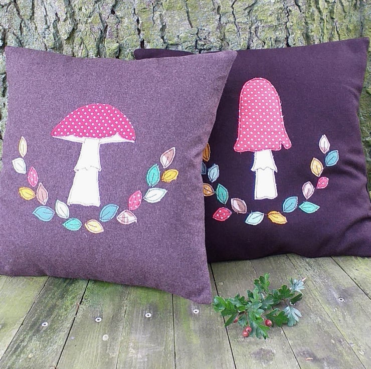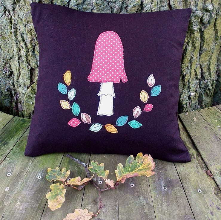 A lovely autumnal wool cushion, with all the softness and cosiness of a evening by the fire. This cushion cover is made from a beautiful chocolate brown wool and has a toadstool and autumnal leaves design. Small pieces of fabric are individually hand cut and appliqued onto the wool using free motion embroidery. The design is repeated in miniature on the back cover. The cover is an envelope style with a green button closure. It measures approximately 37cm square and comes with a feather-filled pad.