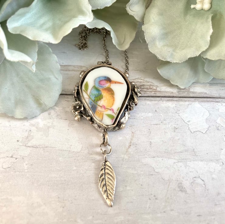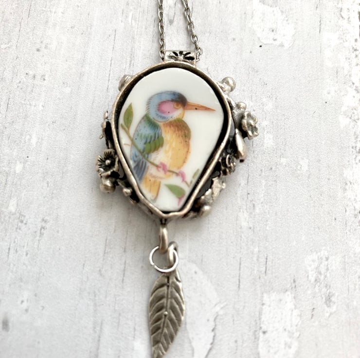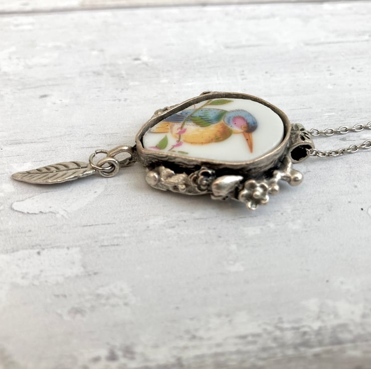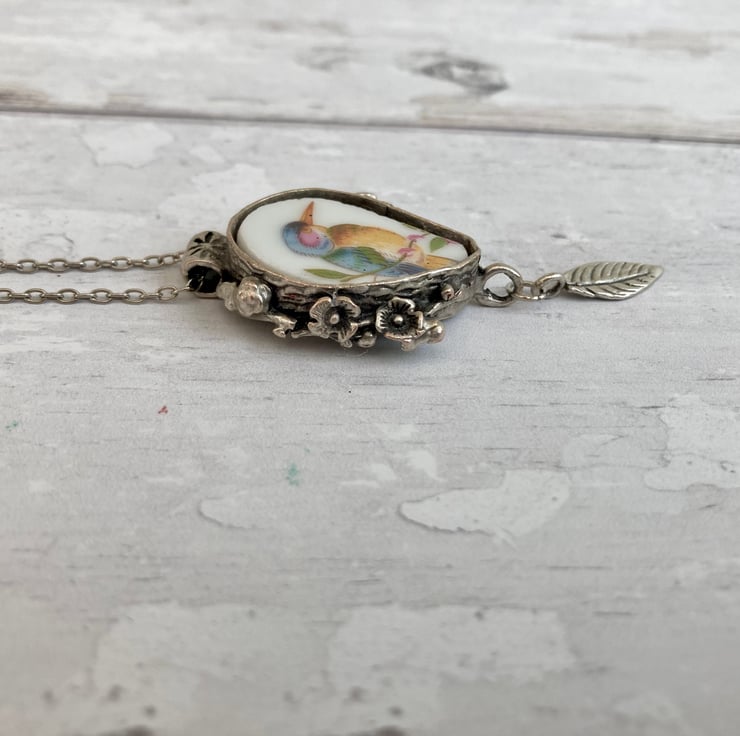 This beautiful handmade broken china pendant necklace has been crafted using a pretty bird patterned vintage china plate. It is carefully set in an antiqued silver plated mount with an antiqued silver plated 17.5-inch curb chain.