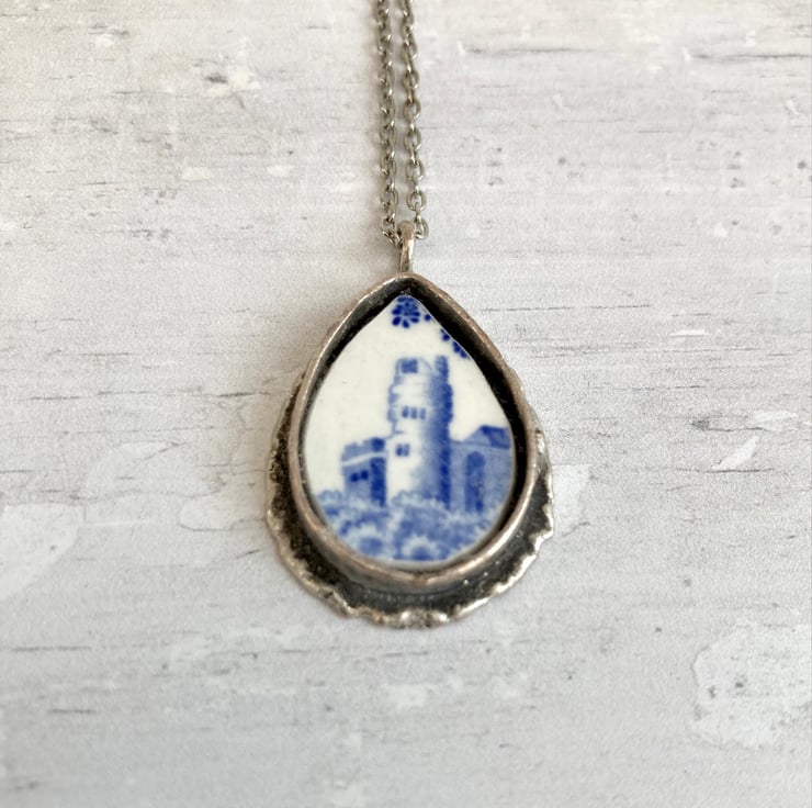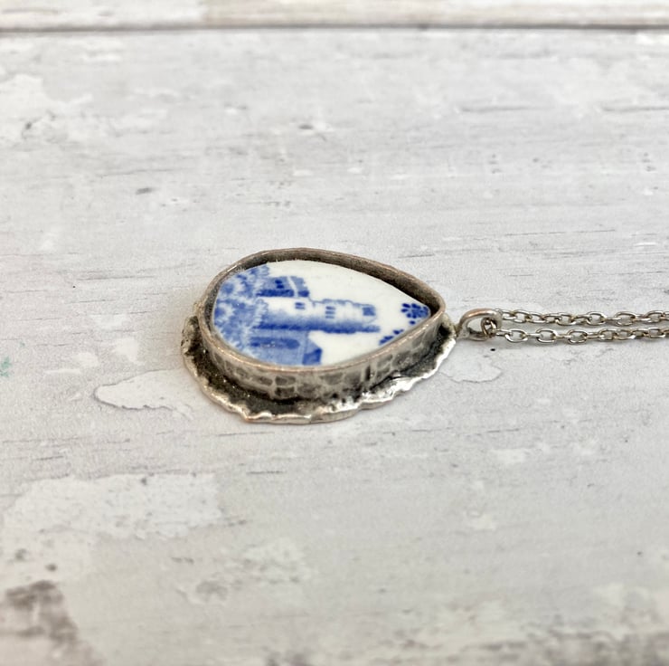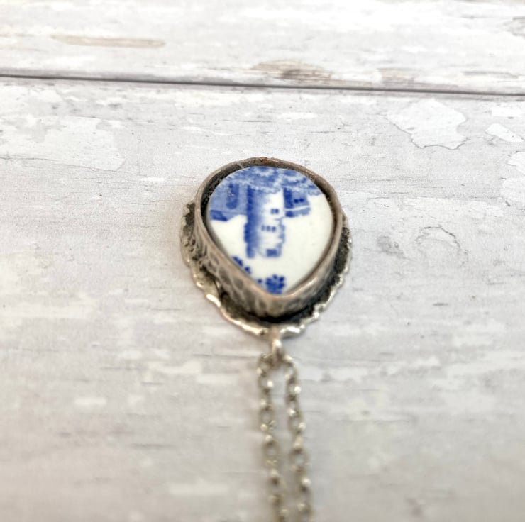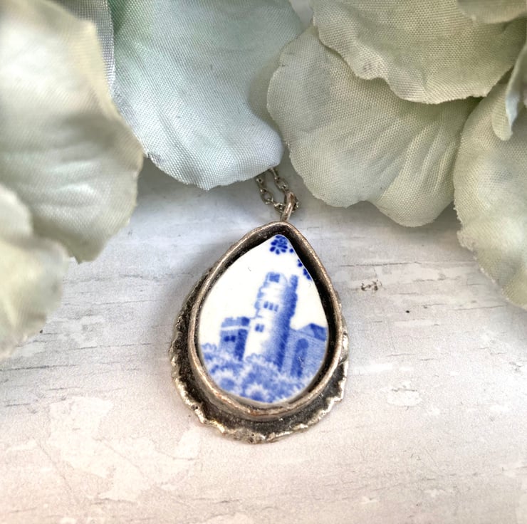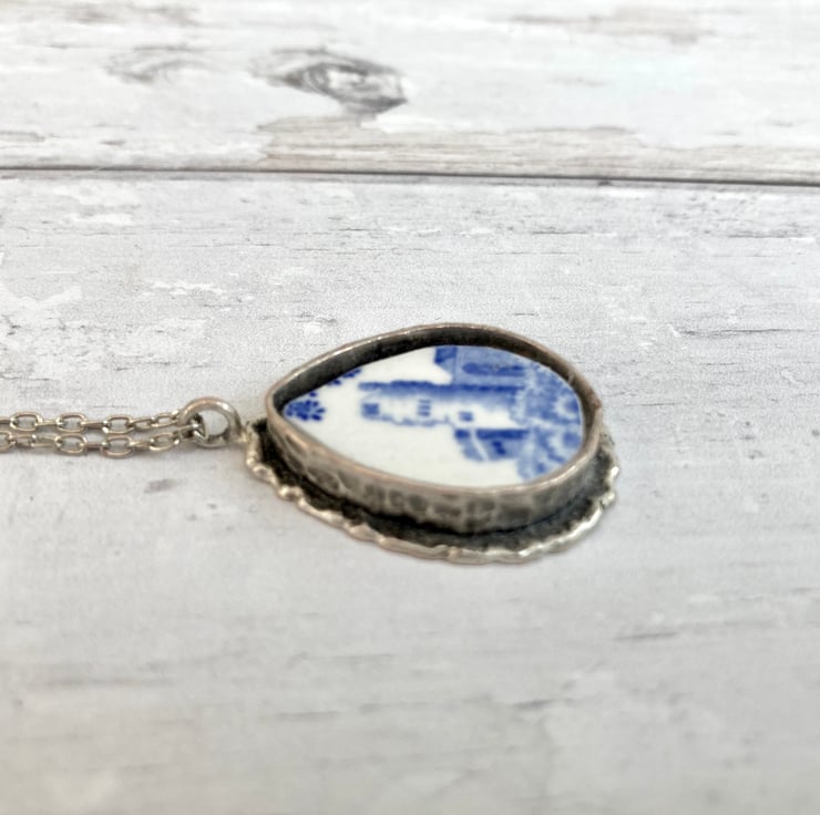 This beautiful handmade broken china pendant necklace has been crafted using a Spode 'Blue Italian' pattern vintage china plate. It is carefully set in an antiqued silver plated mount with an antiqued silver plated 17.5-inch curb chain.