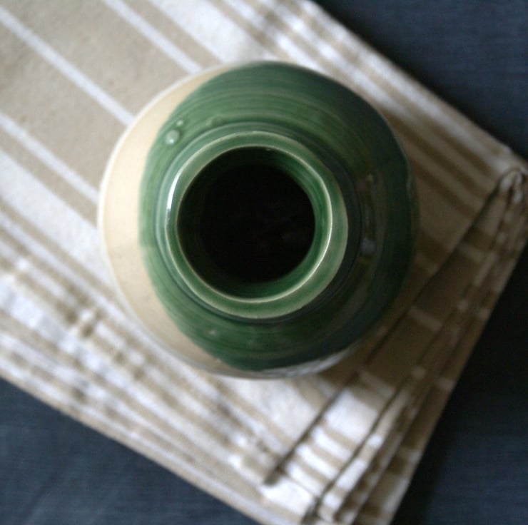 Handmade pottery bottle in green and vanilla.