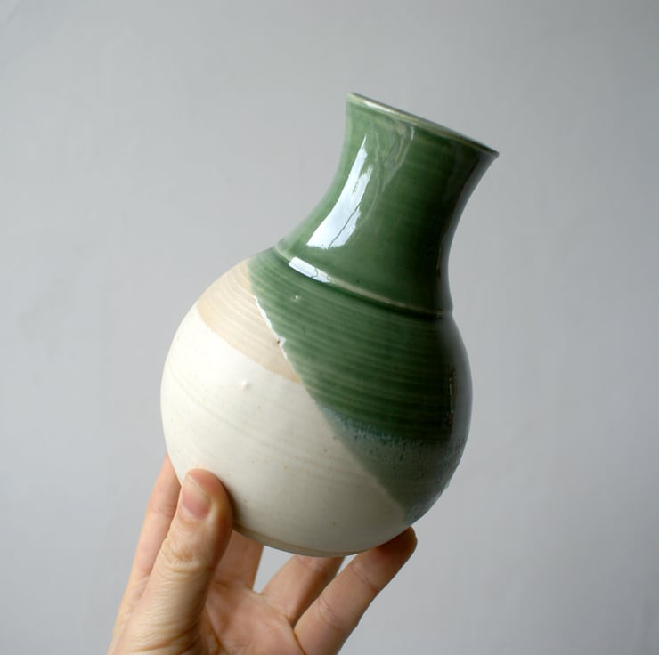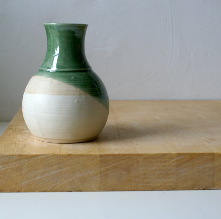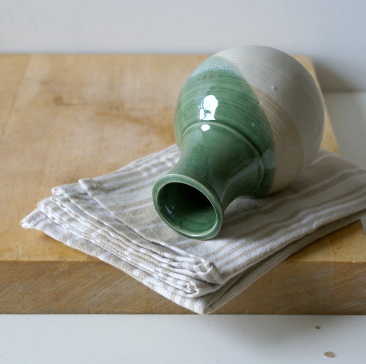 This ceramic bottle was handmade with white Devonshire stoneware clay. It's ideal for bringing small bunches of wild garden flowers such as snowdrops, bluebells and cow parsley in to brighten up a little shelf or corner of your home. The piece has been cross dipped in green and vanilla for a contrast of colours and textures.
