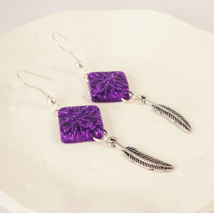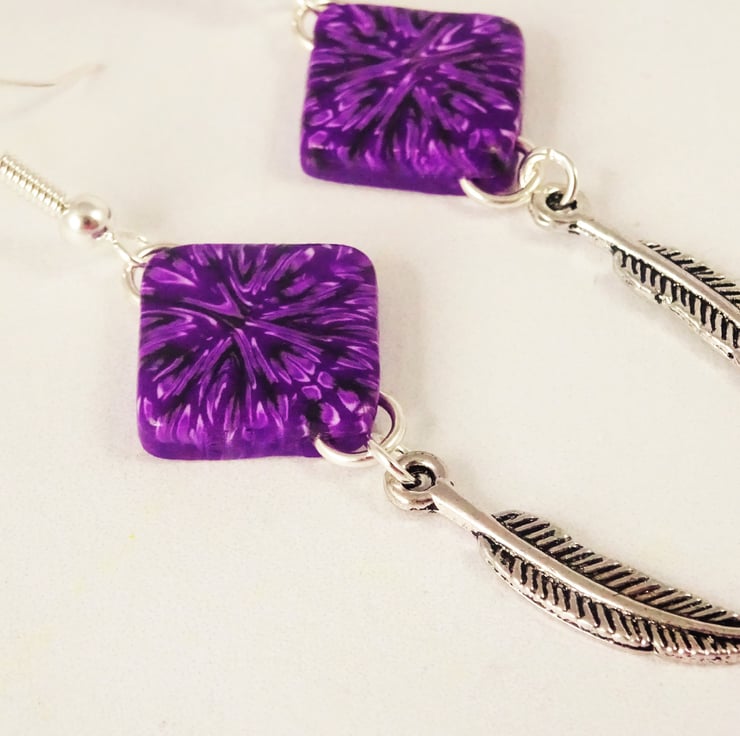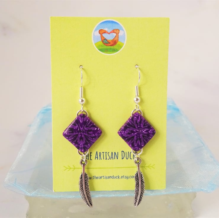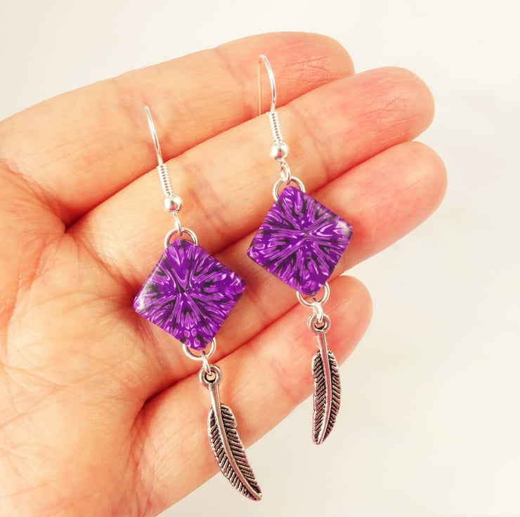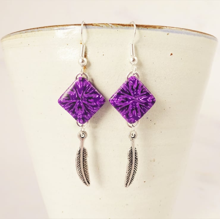 Immerse yourself in an ensemble of grace and charm with these handcrafted patterned purple earrings with a feather drop. Crafted from high-quality polymer clay, these earrings showcase a wonderfully intricate and mesmerizing pattern. Each earring presents a square clay piece with a silver feather charm that adds a touch of boho-chic elegance to the piece.