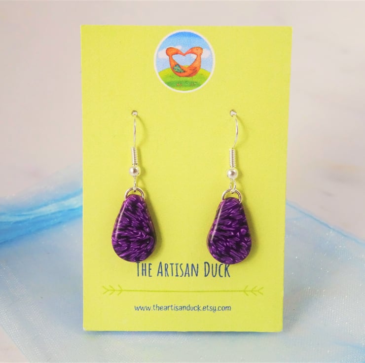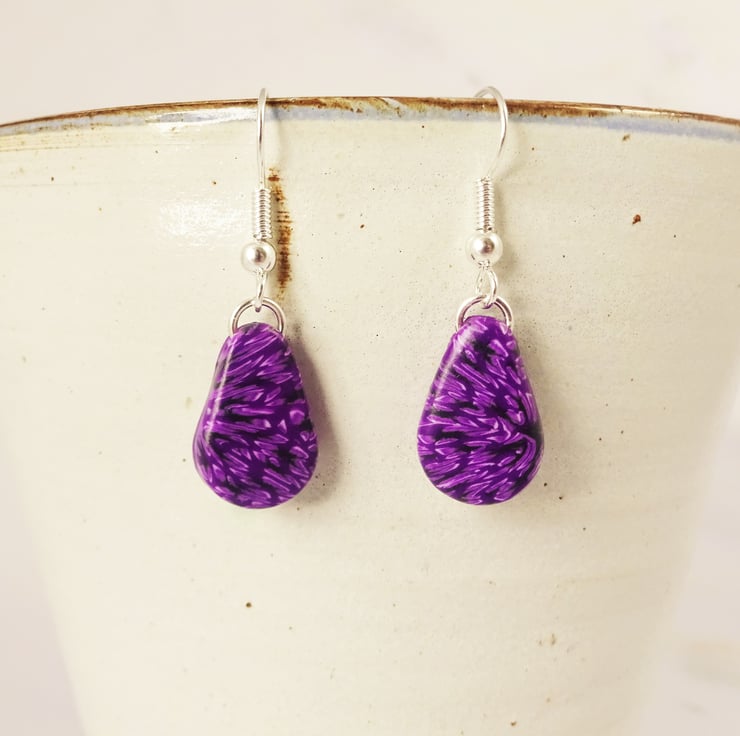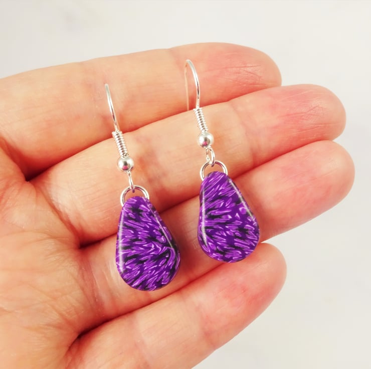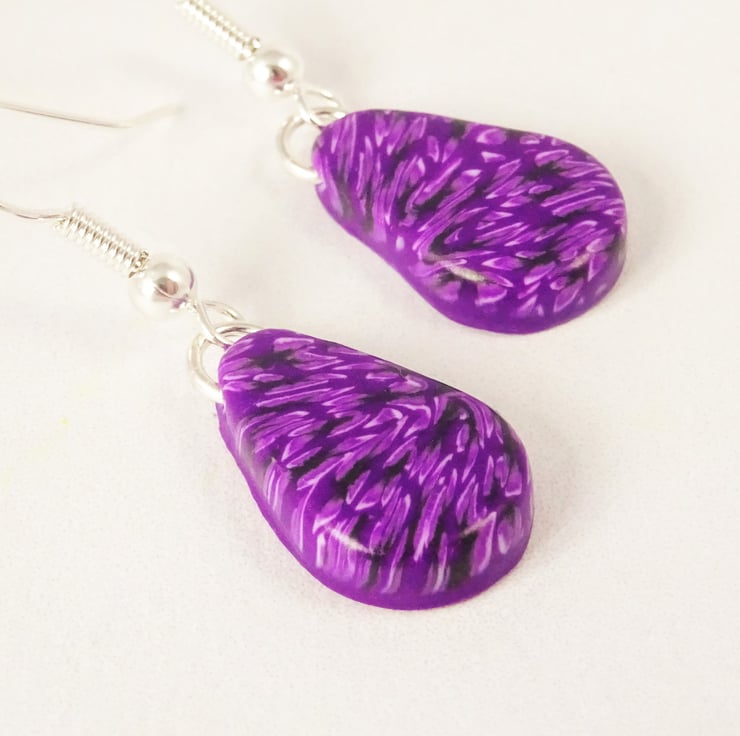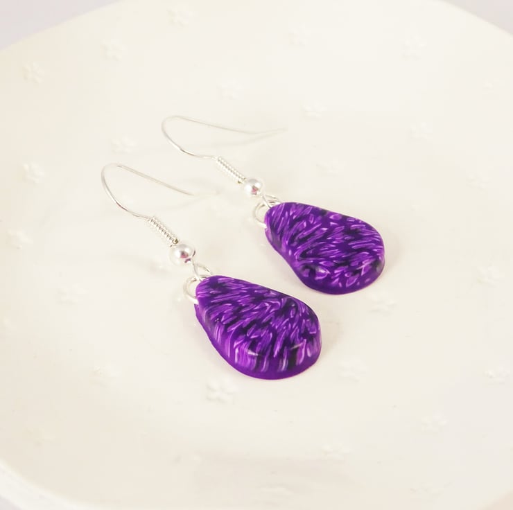 These small drop earrings are lightweight for easy, comfortable wear all day long. Each pair is carefully finished with varnish to subtly enhance the colour and pattern, ensuring a stunning shine in all lighting. The earrings are suspended from silver plated earring wires.. Whether you're sprucing up a casual outfit or accessorizing for a special occasion, these patterned purple earrings promise to keep you in style.