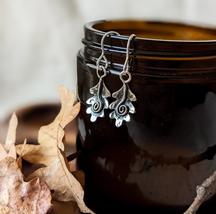 -This is a pair of sterling silver Oak leaf earrings with sterling silver spiral details.